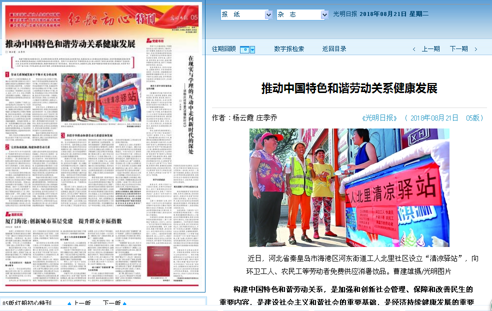 在8月21日出版的《光明日报》第5版“红船初心特刊”上,刊发yl8858永利集团教授杨云霞和人文与经法学院博士研究生庄季乔联合署名的理论文章《推动中国特色和谐劳动关系健康发展》。