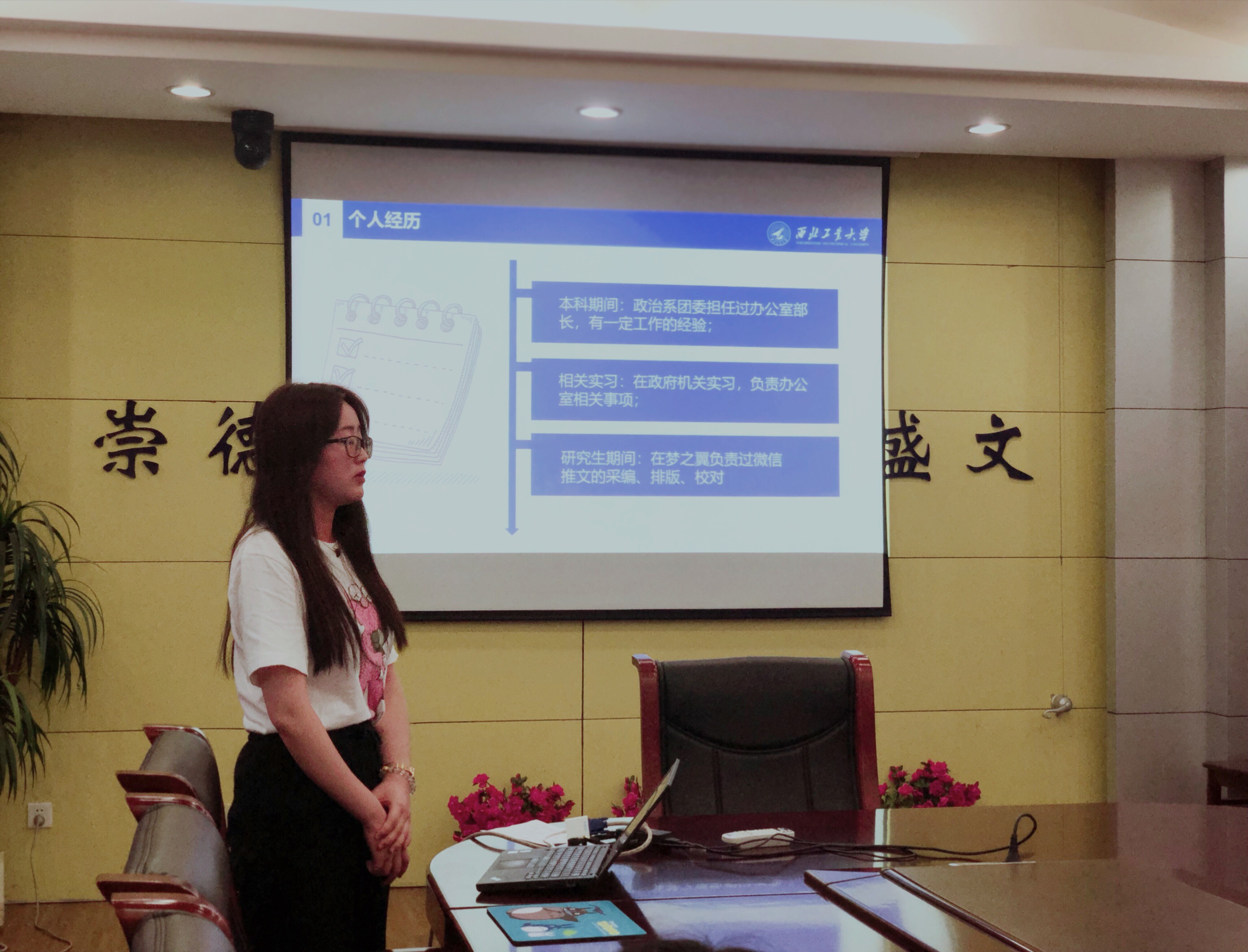 任静从她参与的往期活动、工作计划和竞选目的三方面进行答辩。她总结了前期参加的主题团日活动和社会实践活动,在之后的工作规划中她提出要加强团队内部组织建设、继承弘扬研究生会的优良传统以及改进当前工作中的不足。