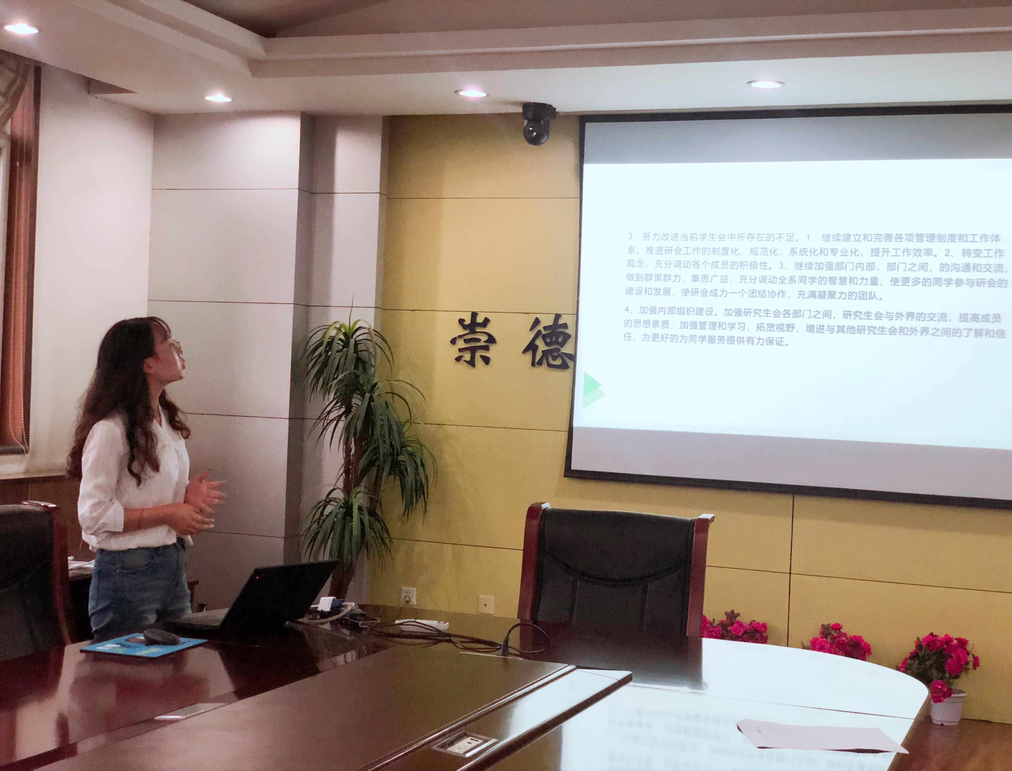 董咪咪总结了自己半年来的工作经历,在研究生会未来的发展规划中,她指出,要制定正确合理的工作规划,划清研会各个部门的职责,保证其有条不紊的运转;同时要组织一系列彰显马院特色的活动,在全校提高我院的存在感和知名度。