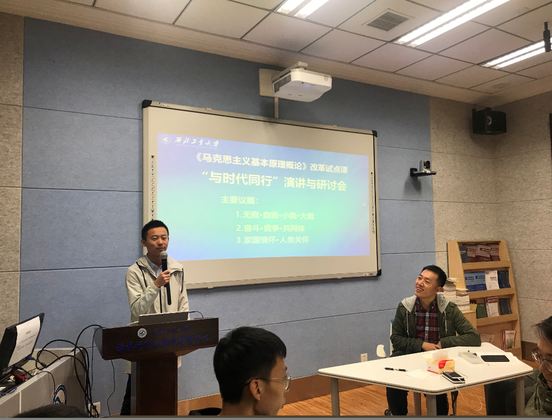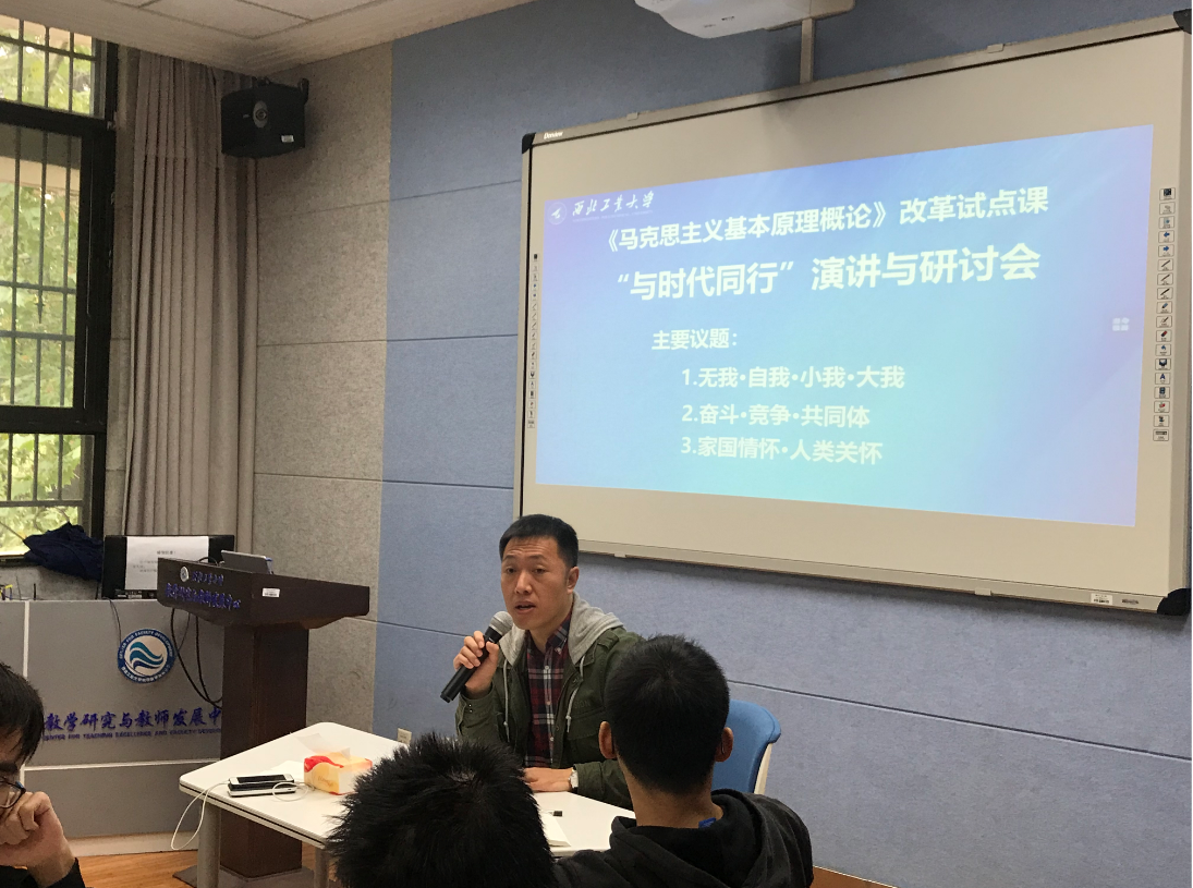 在继前几次课程采用集体辩论、课堂参与互动、小组讨论、雨课堂等学生参与形式的创新后,今天的课,马军老师结合正在讲授的唯物史观内容,巧妙将演讲与学术研讨结合起来,组织题为“与时代同行”的演讲与研讨会,并设置了“无我·自我·小我·大我”“奋斗·竞争·共同体”“家国情怀·人类关怀”三个议题,引导大家运用唯物史观以及马克思主义的基本立场、观点和方法进行演讲和辩论。