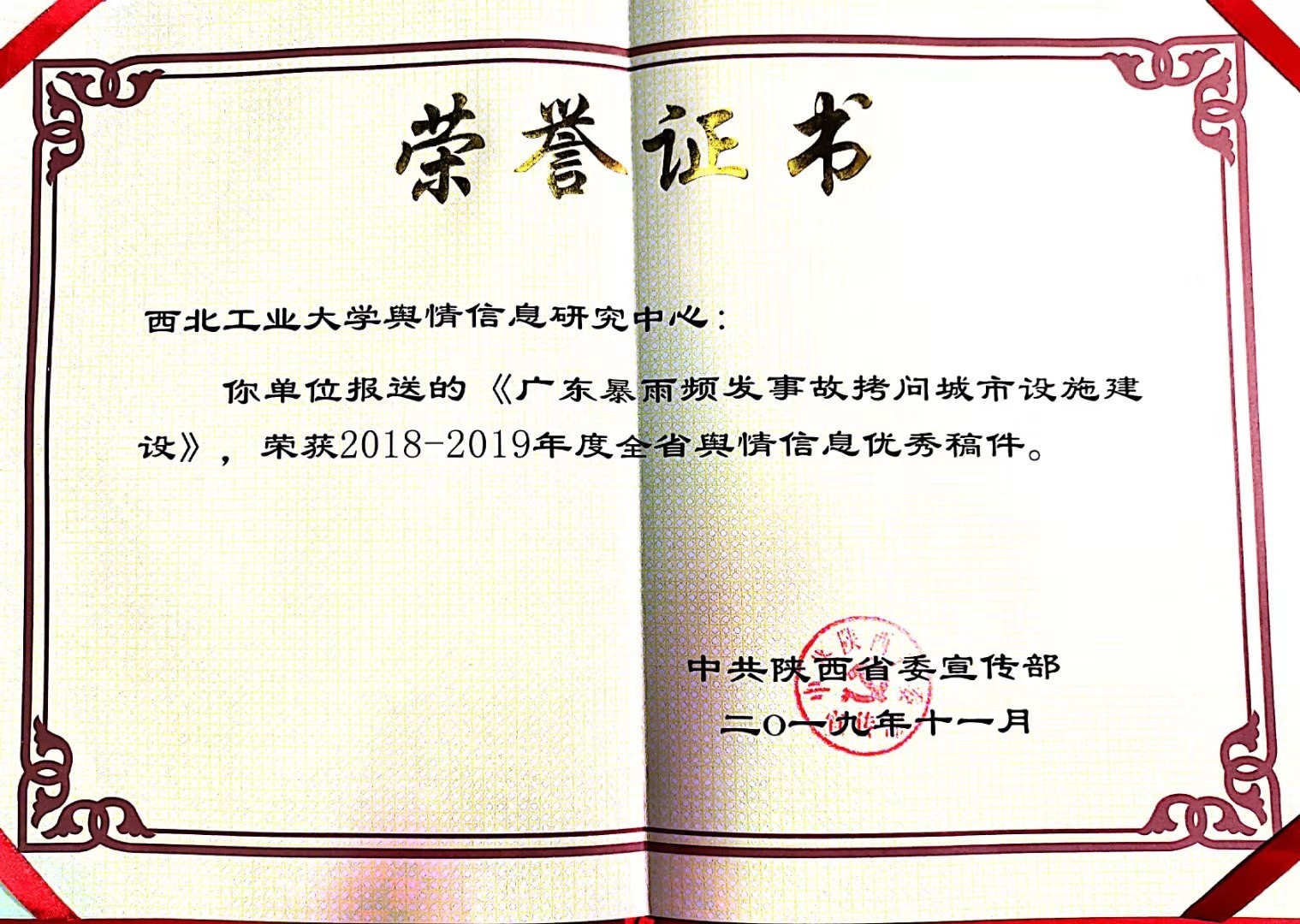 12月12日,2019年陕西省舆情信息工作会议在西安宾馆召开,会议由省委宣传部舆情信息处处长贾永安主持。我校舆情工作表现突出,获得多项荣誉。yl88858永利中国陕西省重点舆情信息研究中心被评为2018-2019年度全省舆情信息工作先进单位、中心副主任贺苗被评为省级先进个人,她撰写的舆情稿件《广东暴雨频发事故拷问城市设施建设》被评为优秀稿件(全省共30篇),并代表中心进行《着力“四个到位”模式 凝聚舆情工作共识》的主题发言。