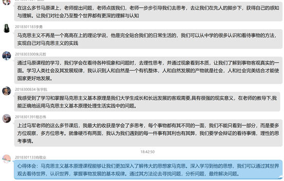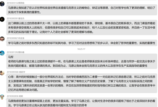 为更好让抽象的哲学理论思想融入学生生活,帮助学生运用马克思主义理论分析解决生活、成长、学习中的具体问题,本课程在课堂授课基础上,还在周末举办三次以“感悟成长”为题的在线沙龙,涉及青春·奋斗·幸福、走进经典、用心生活三个主题,为学生成长、成才解惑答疑。