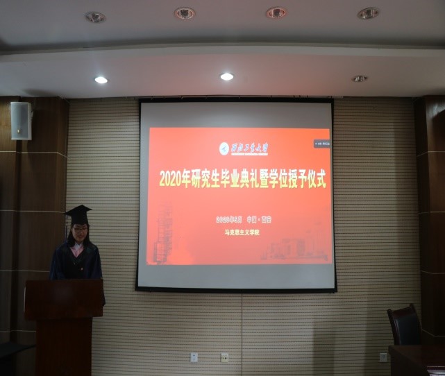 随后,学院举行了分会场学位授予仪式,由党委副书记李刚主持。仪式开始,学院党委书记吴闻川宣读了马院2020年研究生毕业名单,紧接着硕士毕业生代表王酒莉同学发言,她代表毕业生诚挚地表达了对学校、学院的敬意,用朴实的文字记录着三年来的点点滴滴,并借用梁启超在《中国少年说》中唤醒青年的话语,激励同学们勇担时代之责,为国家贡献自己的青春力量。然后,学院师长为毕业生赠送了毕业礼物,鼓励同学们在新的工作岗位上大展鸿图。研究生导师郝保权作为导师代表对毕业生寄予希望,希望同学们在以后的工作、学习、生活中,保持定力,保持警醒,奋发向上,干事创业。在未来的日子里,像朝阳一般,心有芳华,无惧岁月,做一个有朝气、有志气、有底气、有骨气的新时代马克思主义青年。最后,yl8858永利集团院长、学位评定委员会分会主席杨云霞老师与同学们交流,她勉励毕业生在今后的日子里,更要勤奋努力,百尺竿头更进一步。作为马院第一届毕业的研究生,我们共同见证了马院的发展,共同为学院的进步付出了努力和心血,特别是在2020年4月2日成功取得马克思主义理论一级学科博士点,更是让所有人终身铭记,同时学院也见证了同学们的成长成才,希望毕业生们在步入社会以后,常回来看看,分享成功和喜悦,在未来的时光里,展现青马风采,前程似锦,大有作为!