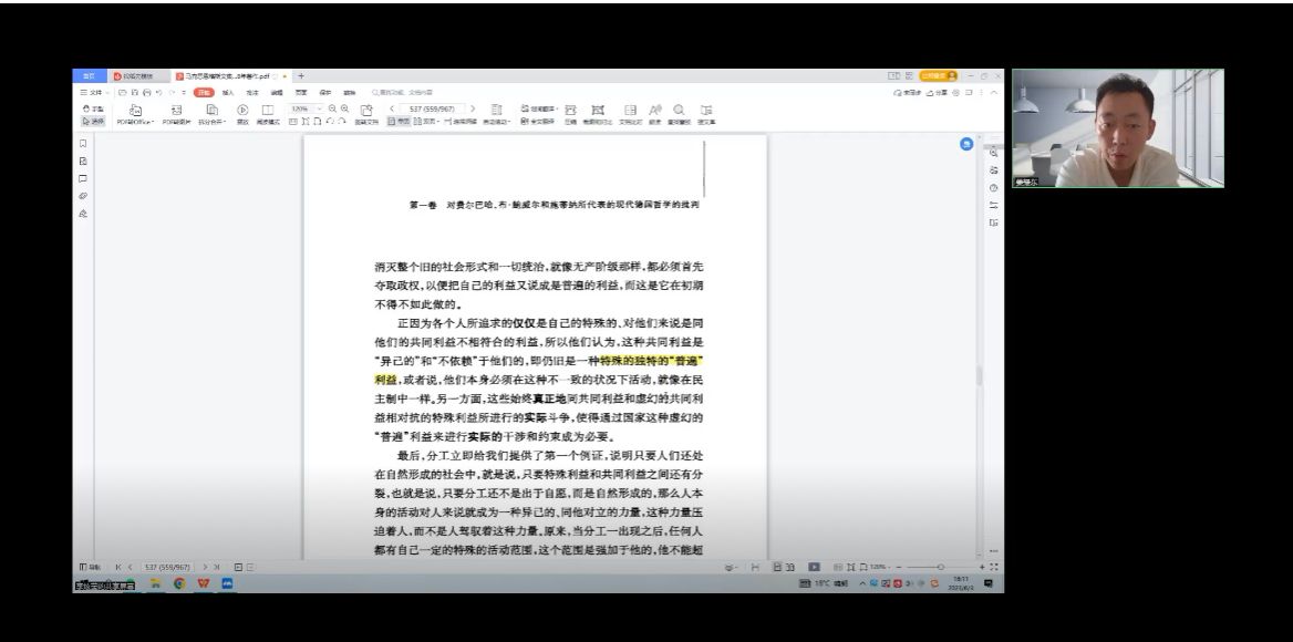 2023年6月3日,yl8858永利集团第43期“启真明智”读书会通过腾讯会议顺利举行。本次读书会由学院齐承水老师主持,东北大学姜耀东老师、温州大学张海波老师与硕博同学们一起阅读了《德意志意识形态》。