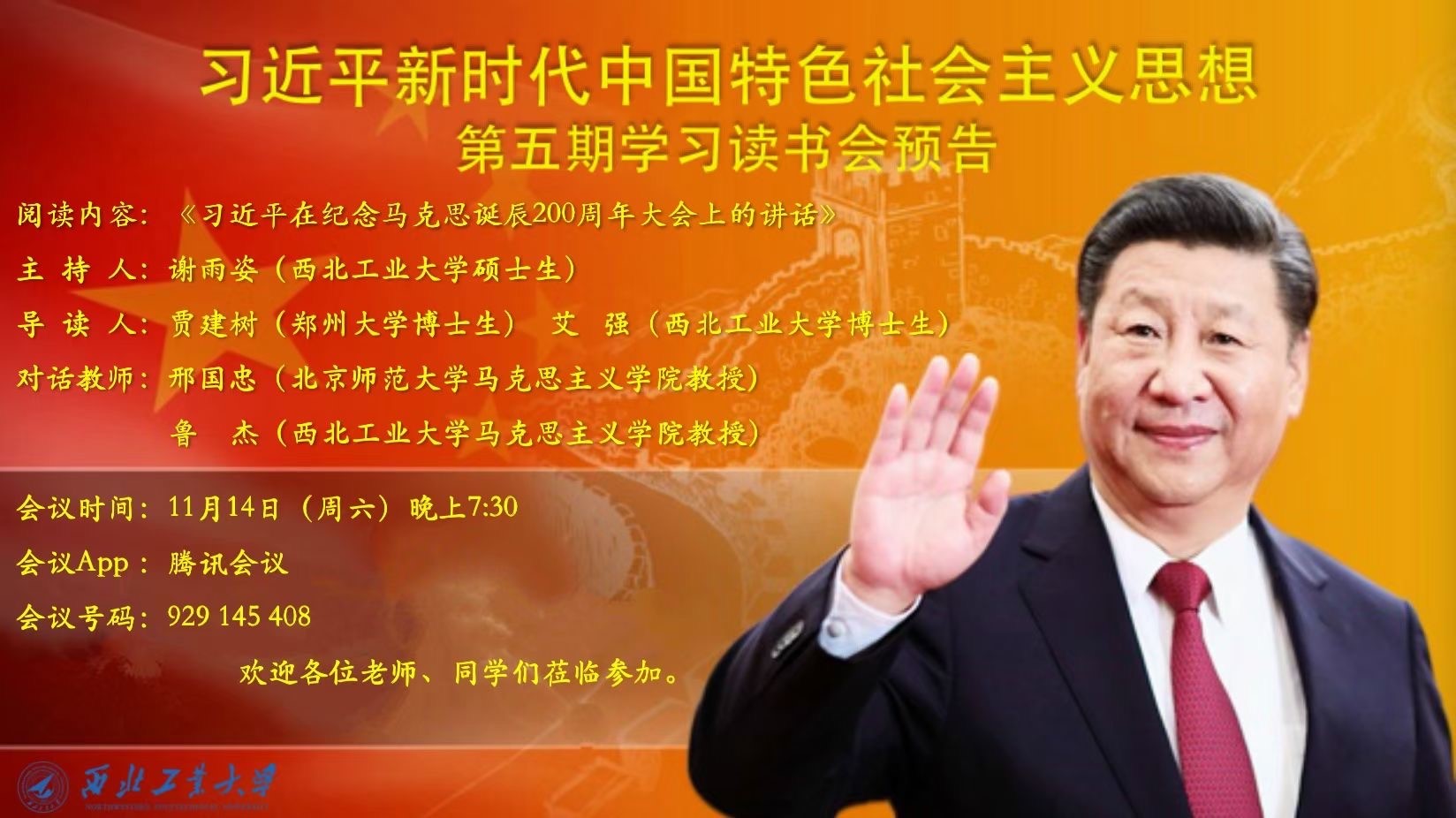 书香有路勤为径,师生阅读相伴行。2020年11月14日,yl8858永利集团习近平新时代中国特色社会主义思想学习读书会第五期活动顺利举办。此次读书会由yl8858永利集团思想政治教育系主任鲁杰教授发起,邀请到北京师范大学yl8858永利集团教授、法学博士、博士生导师刑国忠老师作为本次读书会的特邀嘉宾。本次读书会主题主要围绕《习近平在纪念马克思诞辰200周年大会上的讲话》展开。此次活动由我院硕士生谢雨姿主持,郑州大学、广西大学、西安外国语大学等高校老师和同学们一起参与其中。