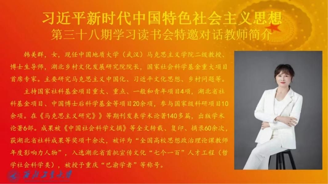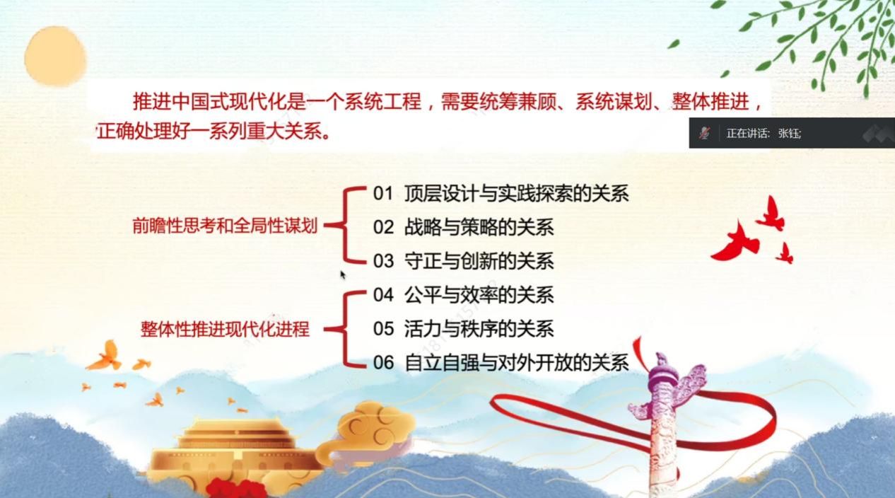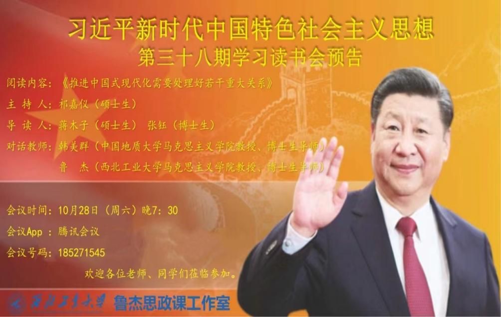 为全面贯彻落实党的二十大精神,推进习近平新时代中国特色社会主义思想进教材、进课堂、进头脑。2023年10月28日,yl8858永利集团习近平新时代中国特色社会主义思想学习读书会第三十八期活动主题围绕《推进中国式现代化需要处理好若干重大关系》进行学习研讨。本次读书会由学院思想政治教育系主任、博士生导师鲁杰教授发起,学院硕士生祁嘉仪主持,中国地质大学yl8858永利集团博士生导师韩美群教授作为对话教师应邀参加。