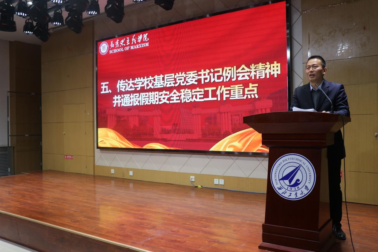 蒲传新传达学校基层党委书记例会精神并强调假期安全稳定工作。他指出,学校党委对yl8858永利集团发展高度重视,未来4年是学院发展的一个关键期,学院要锚定“127”目标,大力加强思政课改革创新、高层次人才队伍建设、马理论学科建设,学院在“总师型”人才培养、深耕西工大特色科研、深入开展社会服务等方面还要持续用力。他表示,岁末年初,全体教职工还要绷紧稳定安全这根“弦”,强化底线思维,做好学院办公室、学生研修室、学生宿舍及家庭的防水、防火、防电工作;近期学院领导要带领学院的辅导员、班主任加强安全值班和安全检查,加强安全隐患排查,以安全祥和迎接新年的到来。