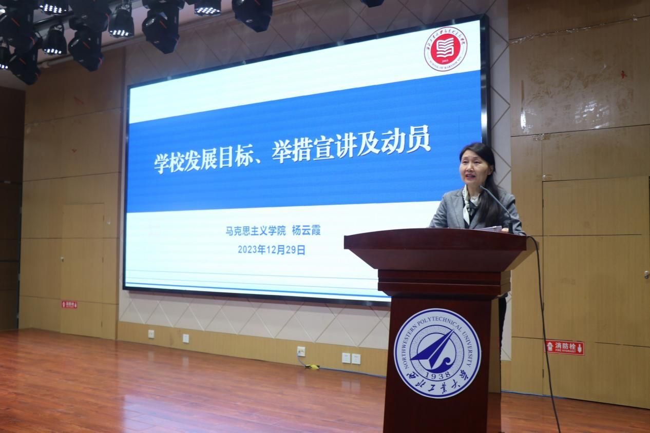 随后,杨云霞传达学校发展目标并进行学院动员。她从学校整体发展、“127”目标、学校下一步发展的思路和举措、师资荣誉及人才成长体系等多方面向与会人员传达了学校重点工作。她指出,在新的一年学院要围绕学校的重点工作逐项展开,保持“标准要高,精神要足,使命要强,团结奋斗,努力拼搏”的工作状态,全体教师要提前规划,全面参与到学院的教学科研、人才培养、高层次人才引育、社会服务等工作中来,接续奋斗、团结奋斗,为学院高质量跨越式发展贡献力量。