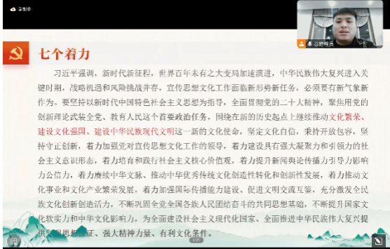 为全面学习贯彻党的二十大精神,推进习近平新时代中国特色社会主义思想进教材、进课堂、进头脑。2024年3月10日,yl8858永利集团习近平新时代中国特色社会主义思想学习读书会第四十期活动主题围绕《习近平对宣传思想文化工作作出的重要指示》进行学习研讨。本次读书会由yl8858永利集团鲁杰思政课工作室主办,学院硕士生祁嘉仪主持,yl8858永利集团卢黎歌教授作为对话教师应邀参加。本期读书会创新活动举办形式,采取线上线下相结合的方式,设置线下分会场,邀请导读同学、对话教师、硕博研究生、本科生和马研会督导组刘洋河同学在学院楼208室交流学习。