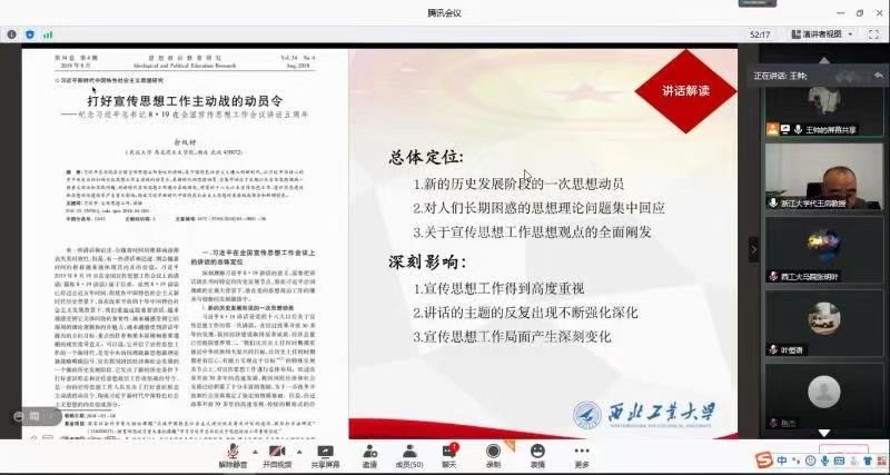 习近平总书记在全国宣传思想工作会议上的重要讲话,深刻总结了党的十八大以来,党的宣传思想工作的历史性成就和历史性变革,深刻阐述了新形势下党的宣传思想工作的历史方位和使命任务,深刻回答了一系列方向性、根本性、全局性、战略性重大问题,对做好新形势下党的宣传思想工作作出重大部署。为了更好深入学习此次讲话内容与精神,2021年1月9日,yl8858永利集团习近平新时代中国特色社会主义思想学习读书会第九期活动主题以《习近平2018年在全国宣传思想工作会议上的讲话》进行展开。此次活动由我院硕士生谢雨姿主持,浙江大学yl8858永利集团副院长、博士生导师代玉启教授,yl8858永利集团思想政治教育系主任、博士生导师鲁杰教授作为对话教师应邀参加,我院党委副书记李刚全程参与。