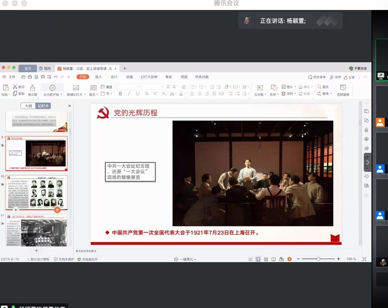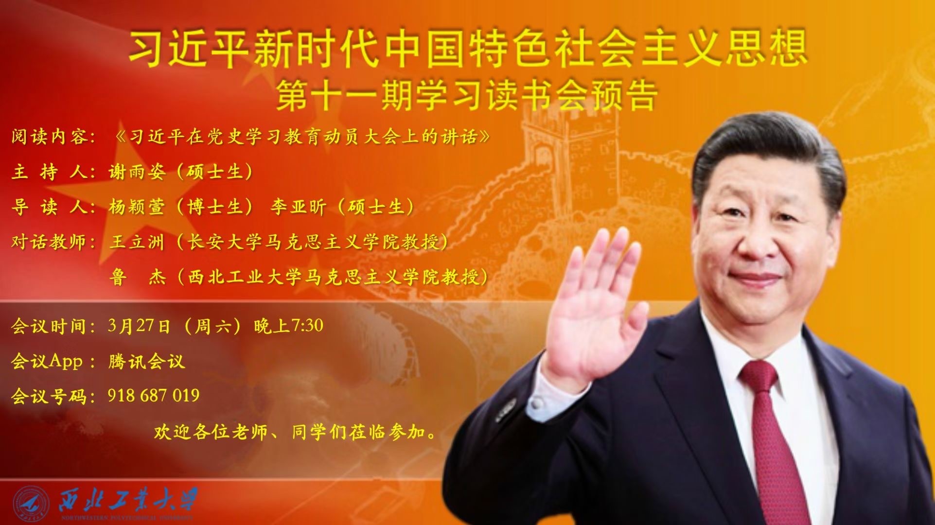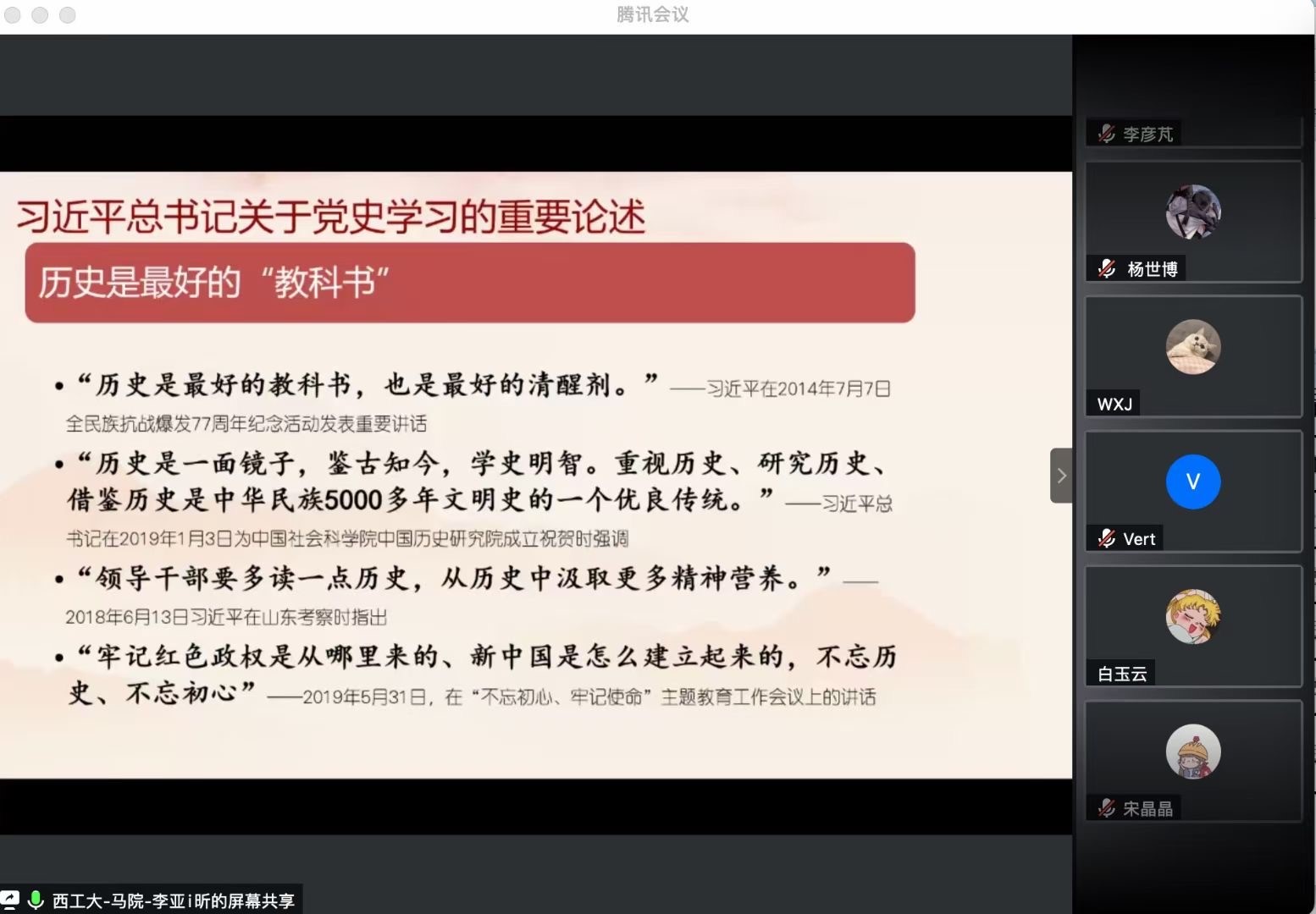 2021年3月27日19点30分,yl8858永利集团习近平新时代中国特色社会主义思想学习读书会第十一期活动在腾讯会议线上如期顺利举行。此次读书会由我院硕士生谢雨姿主持,特别邀请到长安大学yl8858永利集团副院长、西安教育创新协会副会长、陕西高校思想道德修养与法律基础课教学研究会副会长王立洲教授作为本次读书会的特邀嘉宾,yl8858永利集团思想政治教育系主任鲁杰教授与多位硕博生共同参加,以《习近平在党史学习教育动员大会上的讲话》作为本次读书会的主要学习内容,在本次读书会上大家展开了学习交流与讨论。