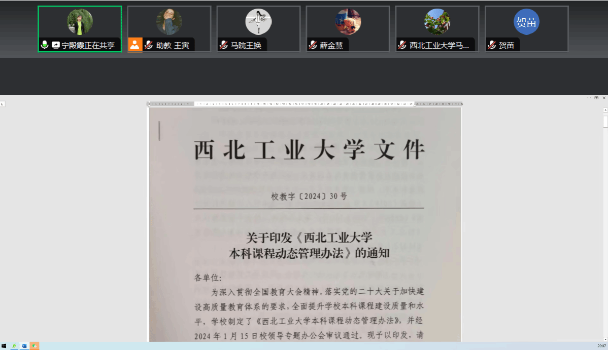 2024年4月25日晚上,《习近平新时代中国特色社会主义思想概论》(以下简称《概论》)课程改革推进会于线上腾讯会议举办。20多名任课教师共同参加本次推进会,yl8858永利集团《概论》课教研室主任宁殿霞副教授主持会议。