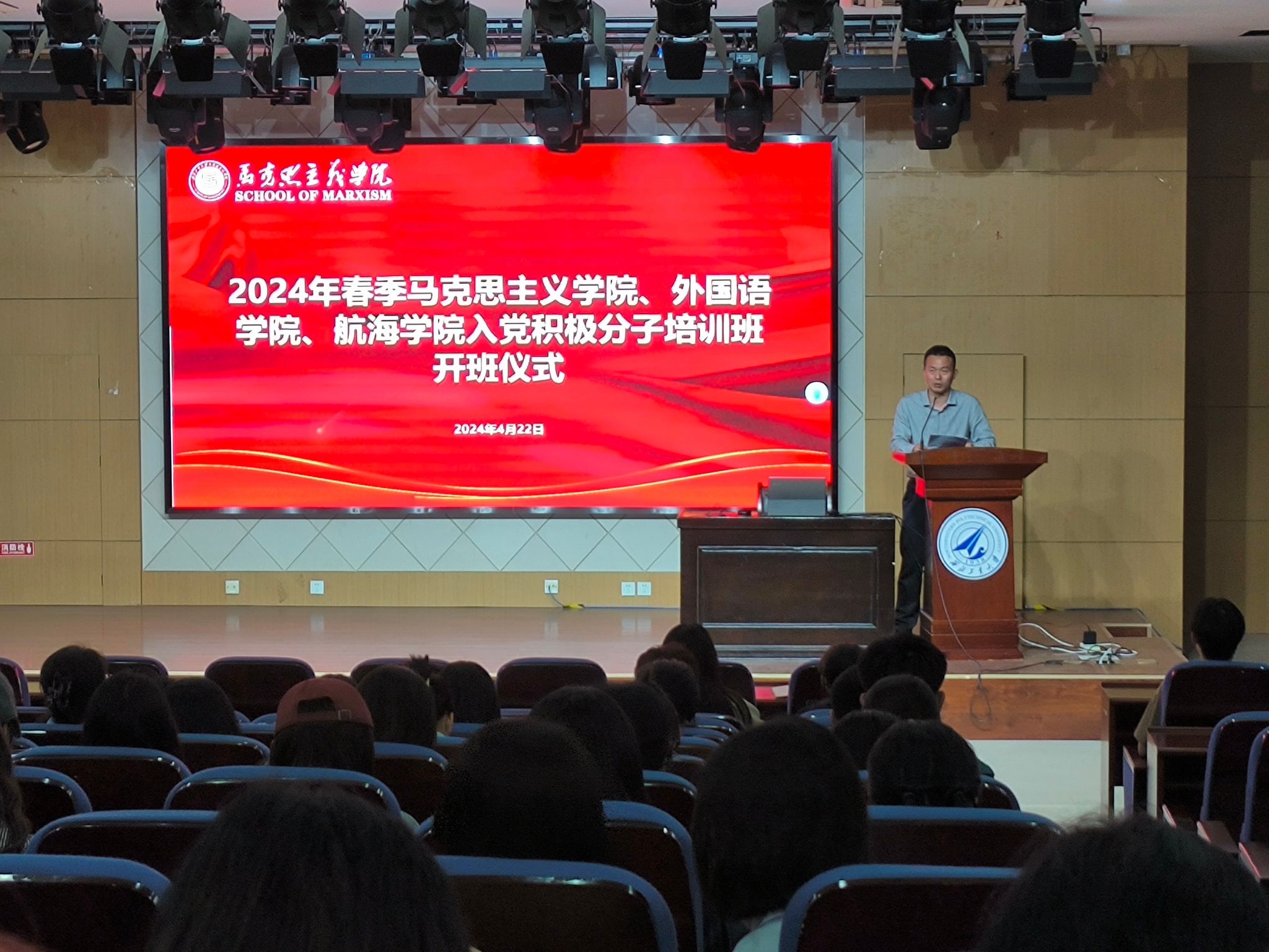 2024年4月22日,我校yl8858永利集团党委书记蒲传新在yl8858永利集团、外国语学院和航海学院联合举办的入党积极分子培训班开班仪式上,为师生们讲授党纪学习教育专题党课。