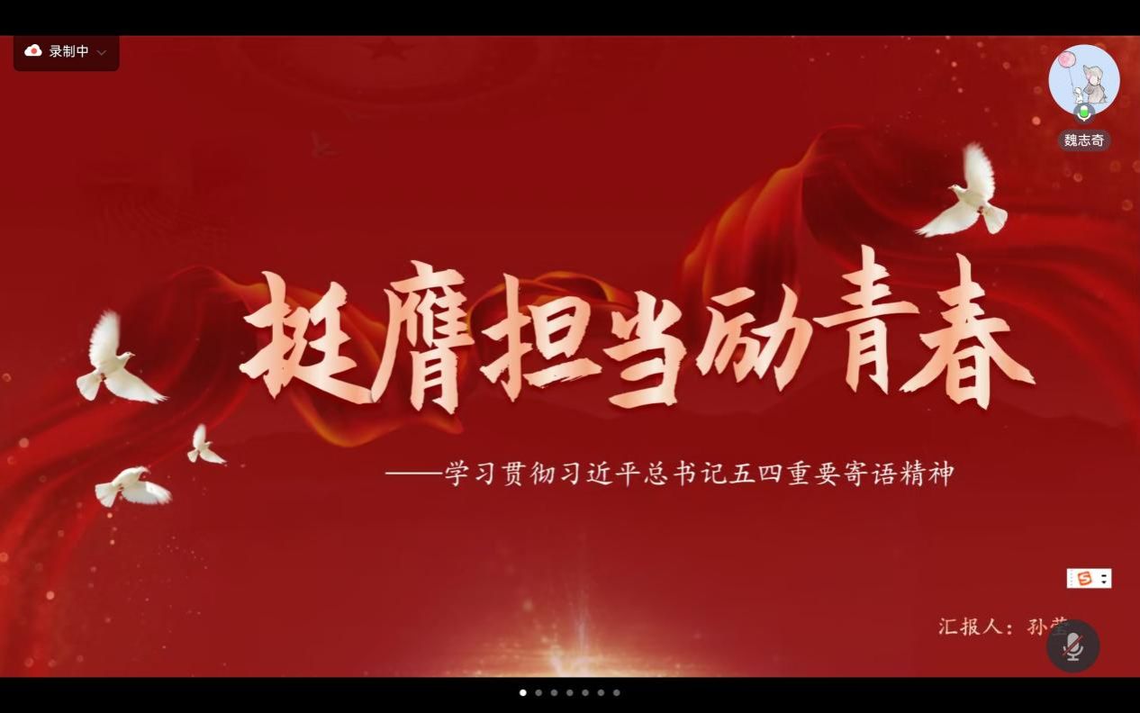 硕士生孙莹以“挺膺担当励青春”为主题,回顾了习近平总书记在党的十八大以来对青年的一系列寄语,从中体悟习近平总书记对青年的关爱。孙莹同学讲到忆峥嵘岁月,传承五四薪火,分析了五四精神在百年历史和时代的发展中不断被赋予的新的内涵,进一步深入阐释五四运动的时代价值与意义。最后提出要以树立远大理想、勇挑时代重任、践行为民初心等实践路径推进新时代青年延续五四精神。