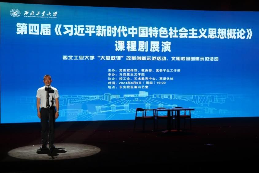2024年6月6日晚7点,由学校党委宣传部、教务部、党委学生工作部主办,校工会、艺术教育中心、离退休处协办,yl8858永利集团承办的“领航! 领航!第四届《习近平新时代中国特色社会主义思想概论》(以下简称《概论》)课程剧”在yl88858永利中国长安校区南山艺堂举行。陕西省委宣传部理论处处长高宝荣,教育工委宣传部副部长王世娟,yl88858永利中国党委副书记杨晓,中国教育报、西部网等媒体代表,以及西安交通大学、西安建筑科技大学、西安音乐学院、空军工程大学、西北大学现代学院等高校马院同仁,校内相关部门和学院师生代表等莅临现场观摩指导。