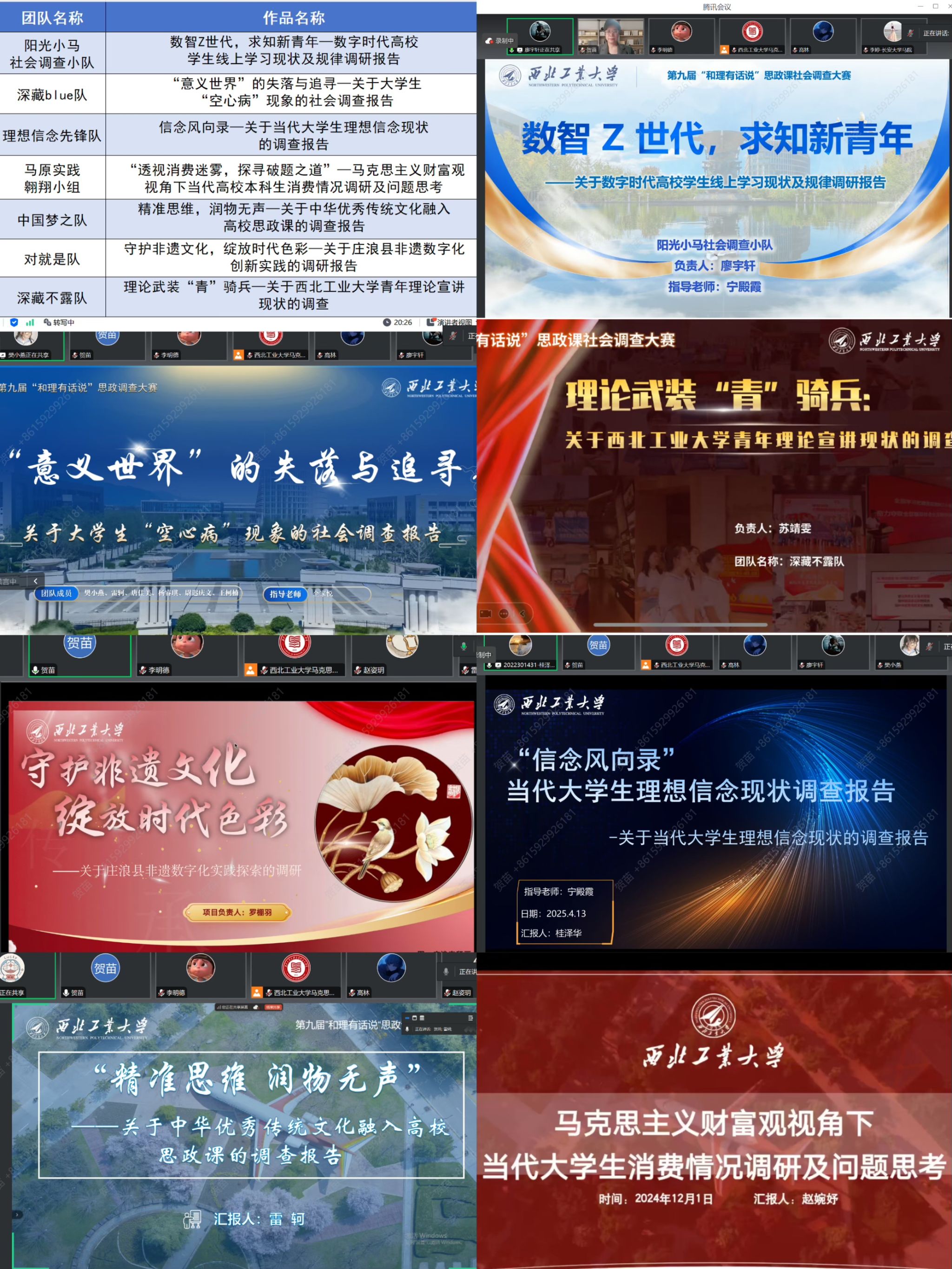 2025年4月13日晚7:00,由yl88858永利中国党委学生工作部、共青团yl88858永利中国委员会、yl88858永利中国教务部、yl88858永利中国研究生院、yl8858永利集团、yl88858永利中国陕西省重点舆情信息研究中心联合举办的第九届“和理有话说”思政课社会调查大赛暨成果展示通过线上形式顺利举办。会议邀请到西安交通大学李明德教授、长安大学李婷教授、yl88858永利中国党委学生工作部副部长、学生处副处长管峻担任评审专家,会议由yl8858永利集团副院长、舆情中心副主任贺苗主持。