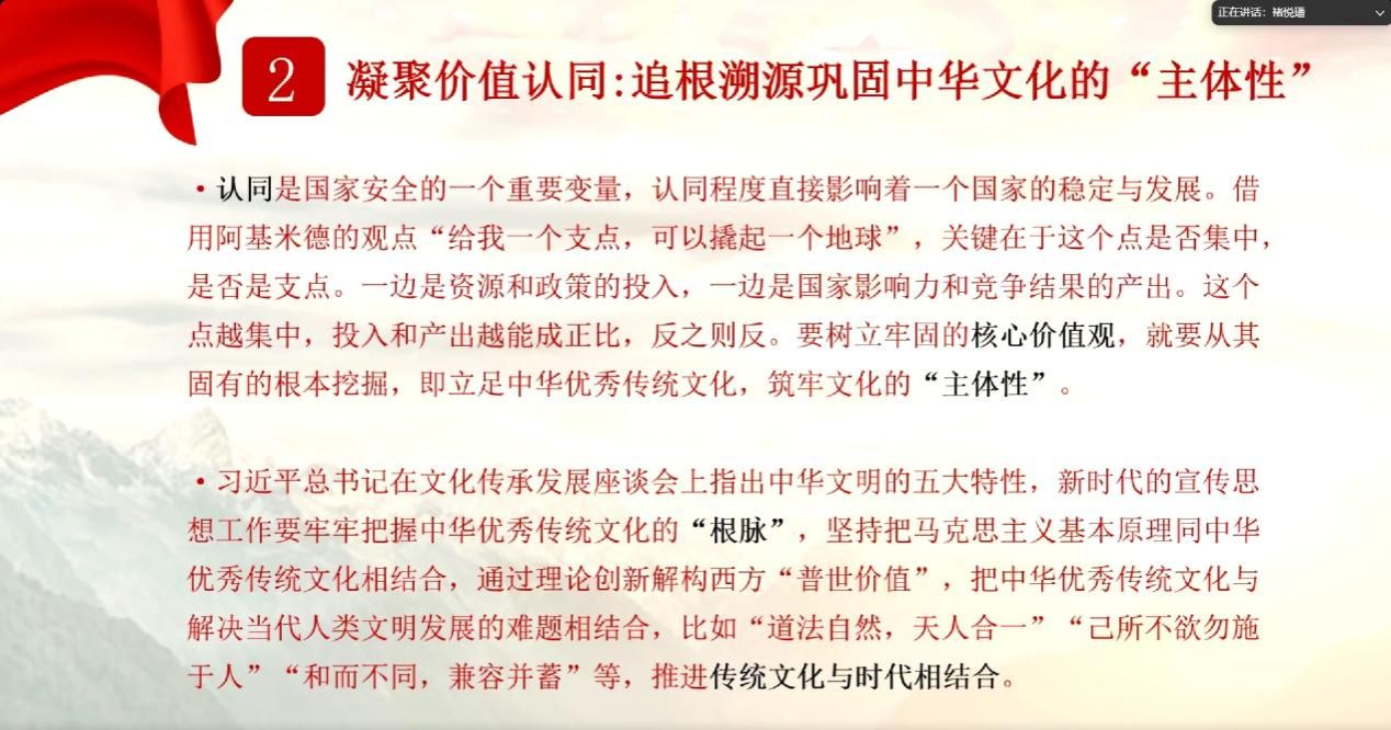 接着,yl8858永利集团硕士生褚悦璠同学,以“两个巩固”根本任务的内在逻辑和实践要求为主题对文本内容进行了深入浅出的解读。同时,她认为宣传思想工作,从根本上就要为人民服务,反映人民呼声。同时还要用科学的先进思想和理论武装头脑,引领社会发展。