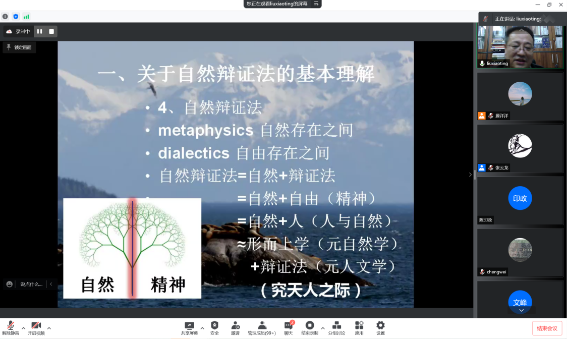 刘孝廷教授从关于自然辩证法的基本理解、自然理解的历程、辩证法理解的历程、新文明观下的自然辩证法、文明转折与第二开端的辩证法五个方面展开本次讲座。首先,刘教授通过介绍相关文献与思想,带领我们深化对自然辩证法的理解。“为什么自然是重要的?”这一问题引出了刘教授对“自然理解的历程”的具体讲解。自然是哲学之根,哲学是从自然哲学而来,科学也是从自然哲学而来。通过分享介绍对自然的历程进行的历史小结与科林伍德论自然观中从古代到近代再到现代的类比,他提出“下一步该如何类比”,这也引发了参会师生对此问题的深思。