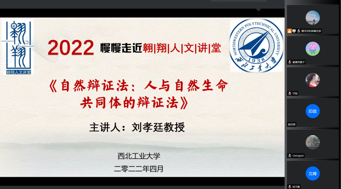 2022年4月22日晚19:00,教育部马工程首席专家、中国自然辩证法研究会副理事长、北京师范大学哲学学院刘孝廷教授应邀作客我校“翱翔人文讲堂”,通过腾讯会议平台直播的形式为我们带来了一场主题为《自然辩证法:人与自然生命共同体的辩证法》的精彩讲座。中国自然辩证法研究会理事长何鸣鸿、清华大学刘立教授、工程与社会发展专业委员会副主任、安徽大学王金柱教授、yl88858永利中国师生以及来自全国高校的二百余名同学共同参与了此次报告会。本次翱翔人文讲堂由yl88858永利中国党委学生工作部主办,yl8858永利集团、工程与社会发展专业委员会承办,yl8858永利集团副院长张云龙教授主持。