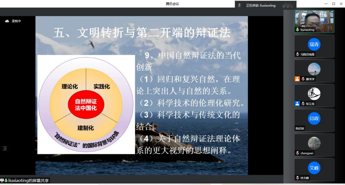 最后,刘教授提出,我们需要重新构造我们的未来,塑造新的精神共同体,人与自然生命共同体。他从存在论、价值论、方法论、行动论四个方面对新文明观下的自然辩证法的建设性纲领进行详尽的介绍,并分享了对中国自然辩证法的当代创新的理解与思考。