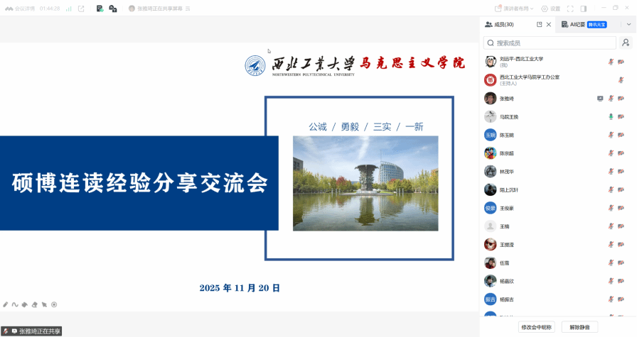 为帮助有意愿申请硕博连读的同学厘清升学路径,解答备考疑惑,缓解心理压力,yl8858永利集团于11月20日举办线上硕博连读经验分享交流会。本次会议以“朋辈引领+政策解读”为主线,通过经验分享、政策剖析为学子们搭建高效互动、共同成长的交流平台,助力学生在学术深造的道路上行稳致远。硕士辅导员王换、研究生培养秘书肖妮及学院学生共同参与,会议由王换主持。