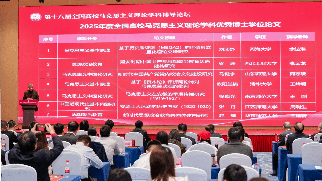 2025年11月22日,第十八届全国高校马克思主义理论学科博导论坛在海口举行,会议期间同步举行了2025年度全国高校马克思主义理论学科优秀博士学位论文颁奖仪式。我校yl8858永利集团2022届毕业生梁珊的博士学位论文《延安时期中国共产党思想政治教育话语建构研究》成功荣获该奖项,其指导教师为张云龙教授。