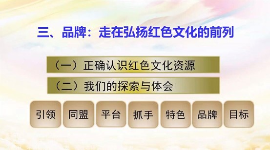 最后,渠长根教授结合多年来从事红色文化研究的实践,从引领、同盟、平台、抓手、特色、品牌、目标等七方面系统解析了红色文化研究的品牌效应。从正确识别红色文化资源、成立红色文化教育基地,首倡并推动创建浙江理工大学红色文化讲习馆、服饰映像馆、红色文化节等研究实践,详实介绍了红色文化进教材、进课堂、进头脑的原则与规律、路径与方法、机制与特色、经验与体会,分享了如何以红色文化为纽带,推动大中小学思政课一体化的典型做法。同时,从盘查家产,整理资源;制定计划,保开并举;学术研究,提升品质;编制教材,实现“三进”;展陈宣讲,迎送结合;专题教育,声色并用;红色旅游,深入人心;文化融合,多业竞创;内外联动,共享共赢;凝神聚力,本地品牌等十个方面为推动红色文化事业给予了具体建议。