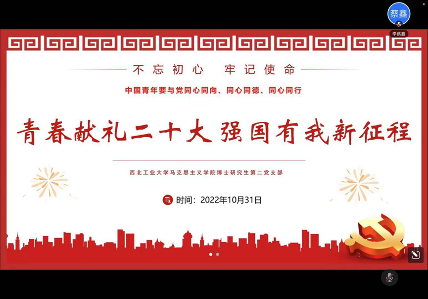 百年逢盛会,青春正当时。10月31日晚上,yl8858永利集团博士生第二党支部在线召开了“青春献礼二十大 强国有我新征程”的主题党日活动。主题党日以集体学习和集体讨论相结合的形式,组织党员学习党的二十大报告全文,接受思想滋养,凝聚青春力量。博士生第二党支部全体成员参加了会议。会议由支部书记李水主持,各位党员首先就党的二十大报告开展了集体学习,随后分别讨论了各自的学习体会。