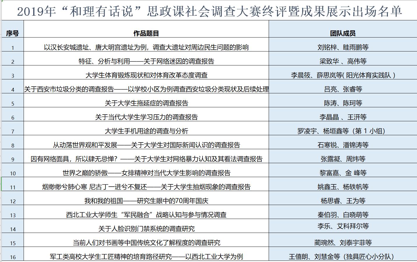 At 19:00 on April 10, 2020, the final assessment and results display of the 2019 Social Survey Competition of Ideological and Political Course was held as scheduled through online video, which was jointly organized by School of Marxism of NPU, Undergraduate Student AffairsDepartmentofthe NPUCommitteeof the CPC, and Key Public Opinion Information Research Center in Shaanxi Province of NPU.Wei Yan, Director of the Comment Department of Shaanxi Daily, Ma Jun, Deputy Director of the Undergraduate Student AffairsDepartmentofthe NPUCommitteeof the CPC, and Professor Lu Jie of School of Marxism were invited to be review experts for this competition.Dai Fuping, Director of Undergraduate Student AffairsDepartmentofthe NPUCommitteeof the CPC and Director of Undergraduate Student AffairsDepartment, and Wu Wenchuan,Deputy Party Secretary ofSchool of Marxism, participated in this competition, which was presided over by He Miao, Assistant Dean of School of Marxism and Deputy Director of the Public Opinion Center.