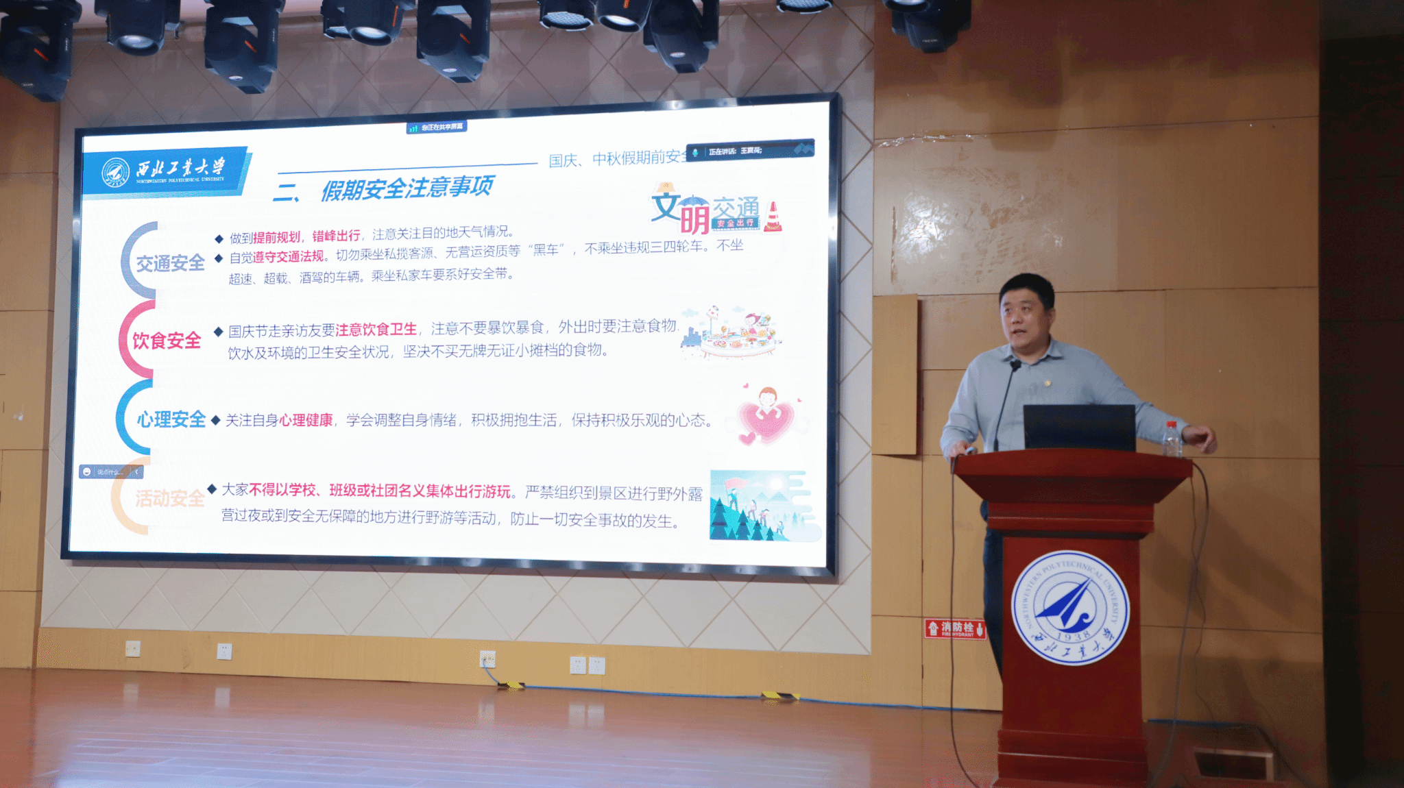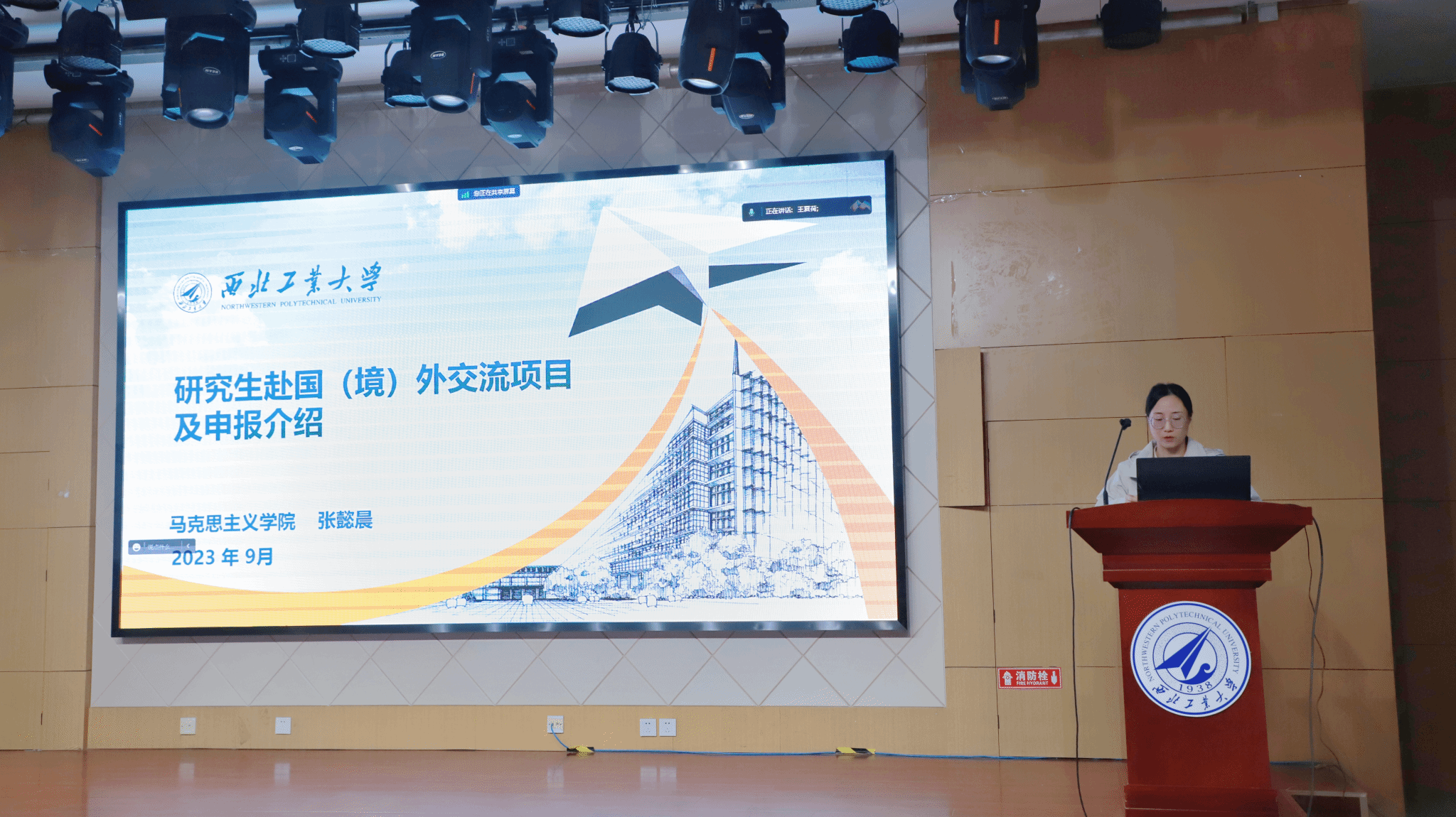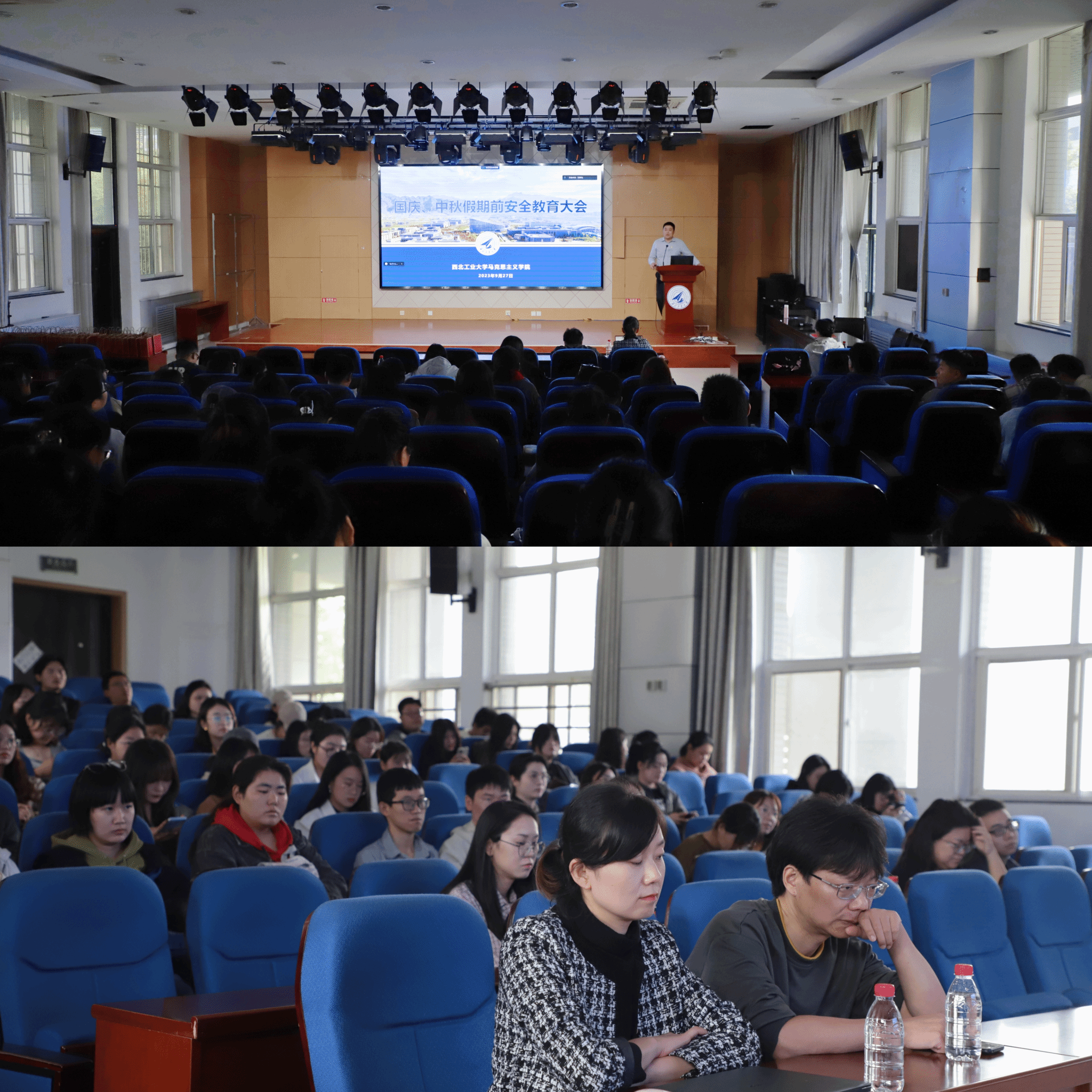 Mid-Autumn Festival and National Day are approaching, in order to let students spend a safe and happy holiday and enhance their safety precautionary awareness and risk avoidance ability, on the afternoon of September 27, the School of Marxism of NPU held a meeting on safety education and sharing of postgraduates' exchange projects to overseas before National Day and Mid-Autumn Festival holiday, which was held in the 207 Lecture Theatre of the School. All the students of the School of Marxism and Gao Hongbo, counsellor of doctoral students, Wang Chang, counsellor of master's students, and Zhang Yichen, secretary of foreign affairs of the School of Marxism, attended the meeting, which was presided over by Li Gang, deputy secretary of the Party Committee of the School.