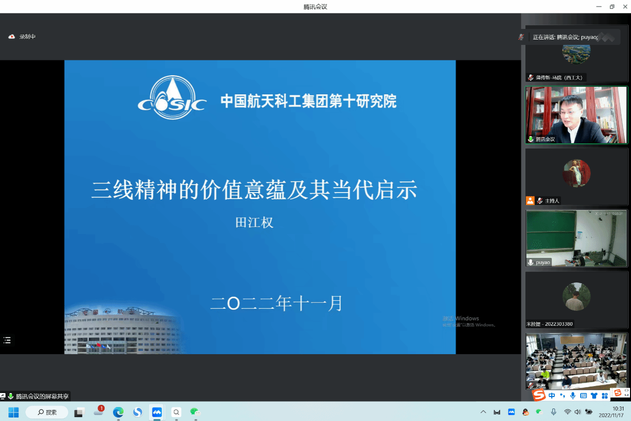 为深入贯彻落实习近平总书记关于“大思政课”的指示批示,深化巩固“四史”教育的课程效果,11月17日,我校邀请到中国航天科工集团第十研究院田江权高级工程师做客翱翔名家讲堂,在云端开展《三线精神的价值意蕴及其当代价值》思政课程交流。本次活动由党委学生工作部主办、yl8858永利集团承办。yl8858永利集团党委副书记(主持工作)蒲传新、院长助理赵海霞,陕西省思政名师工作室负责人蒲瑶,思政课教师马新蕊、山磊、杜轶伦,以及《中国近现代史纲要》课程的学生共500余人参加了学习。