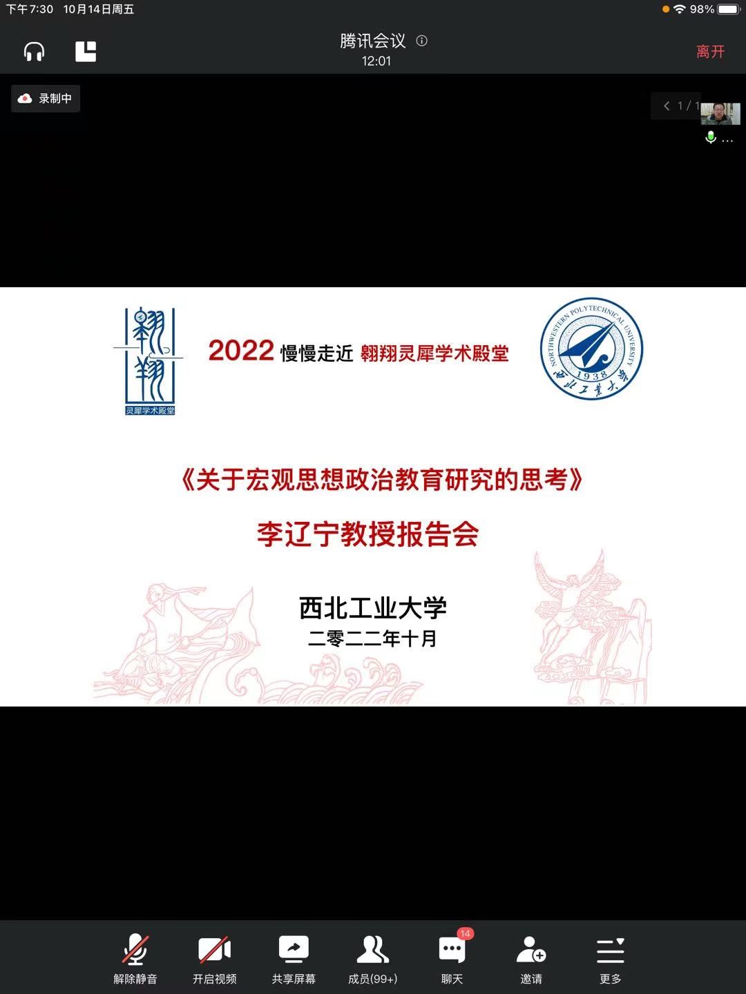 2022年10月14日晚19:30,国家社科基金重大项目首席专家、国家社科基金年度项目通讯评审专家、四川大学yl8858永利集团李辽宁教授应邀做客我校“翱翔灵犀学术殿堂”,通过腾讯会议平台直播的形式为我们带来了一场主题为《关于宏观思想政治教育的思考》的精彩报告。yl8858永利集团思想政治教育系主任鲁杰教授主持报告会,来自yl88858永利中国、四川大学、东北大学等200余名师生共同参加了此次活动。