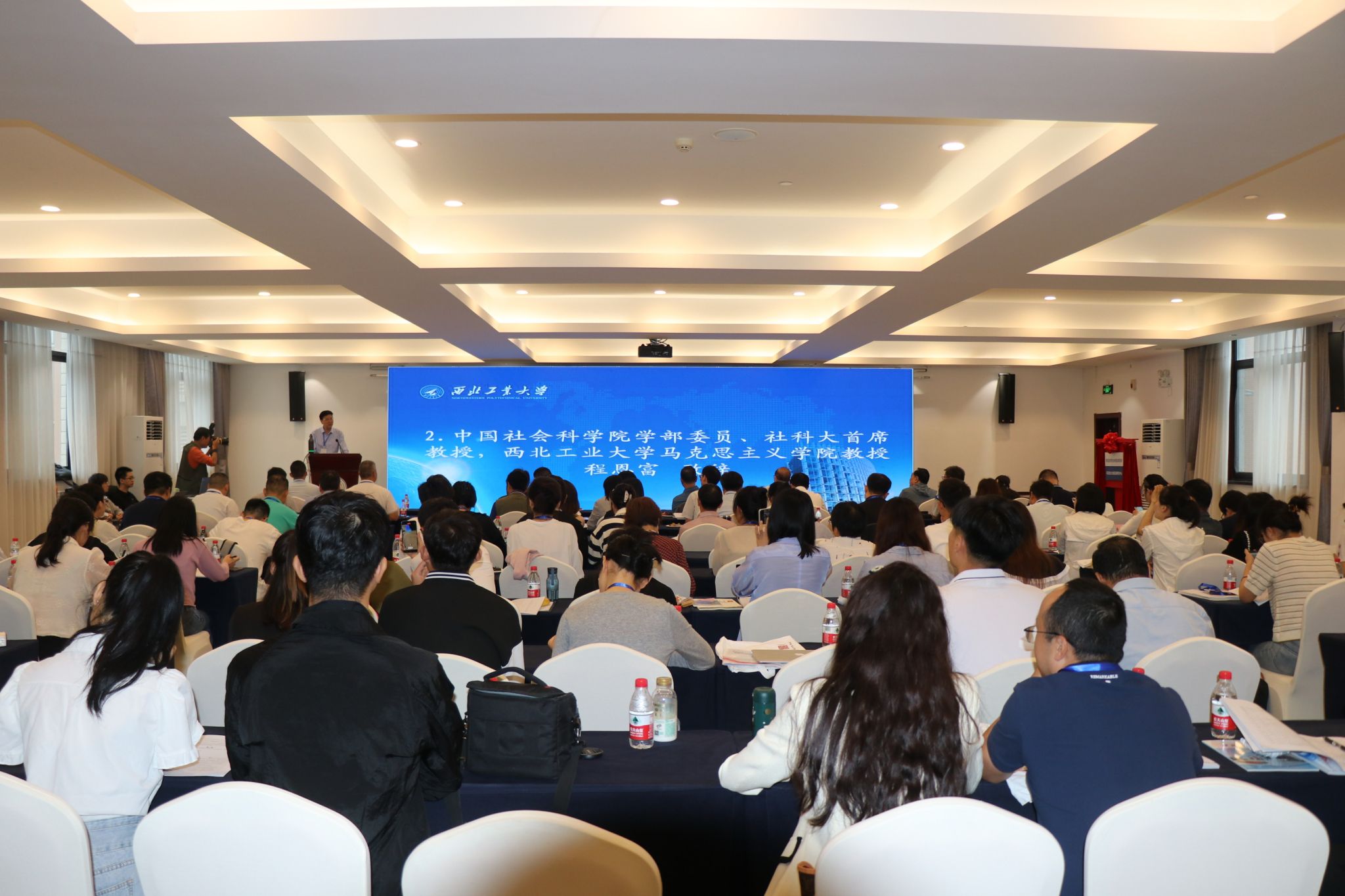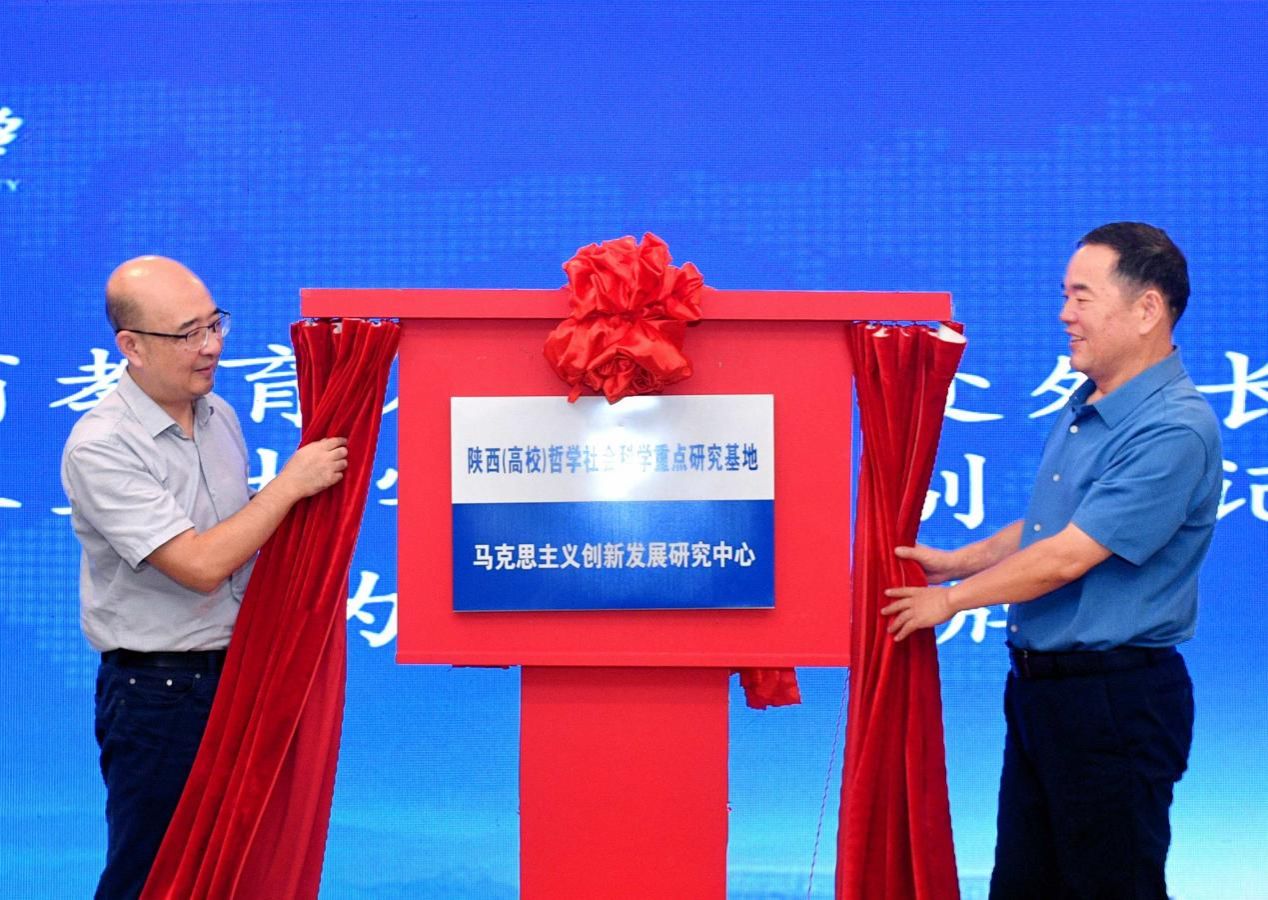 随后,朱晓冬与陈建有为陕西(高校)哲学社会科学重点研究基地“马克思主义创新发展研究中心”揭牌,与会专家学者合影留念。