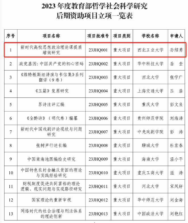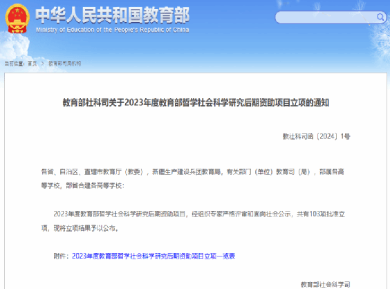 据悉,后期资助项目是教育部人文社科研究项目主要类别之一,旨在鼓励高校教师厚积薄发,加强基础研究,勇于理论创新,推出精品力作。其中,重大项目主要资助对学术发展具有重要推动作用、具有重大学术价值的标志性成果。