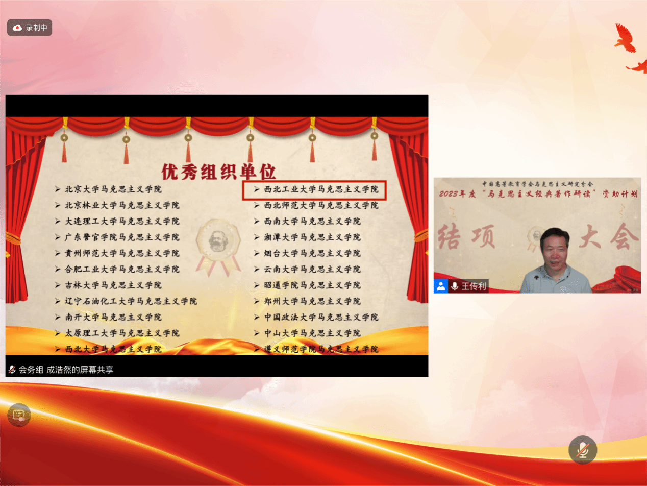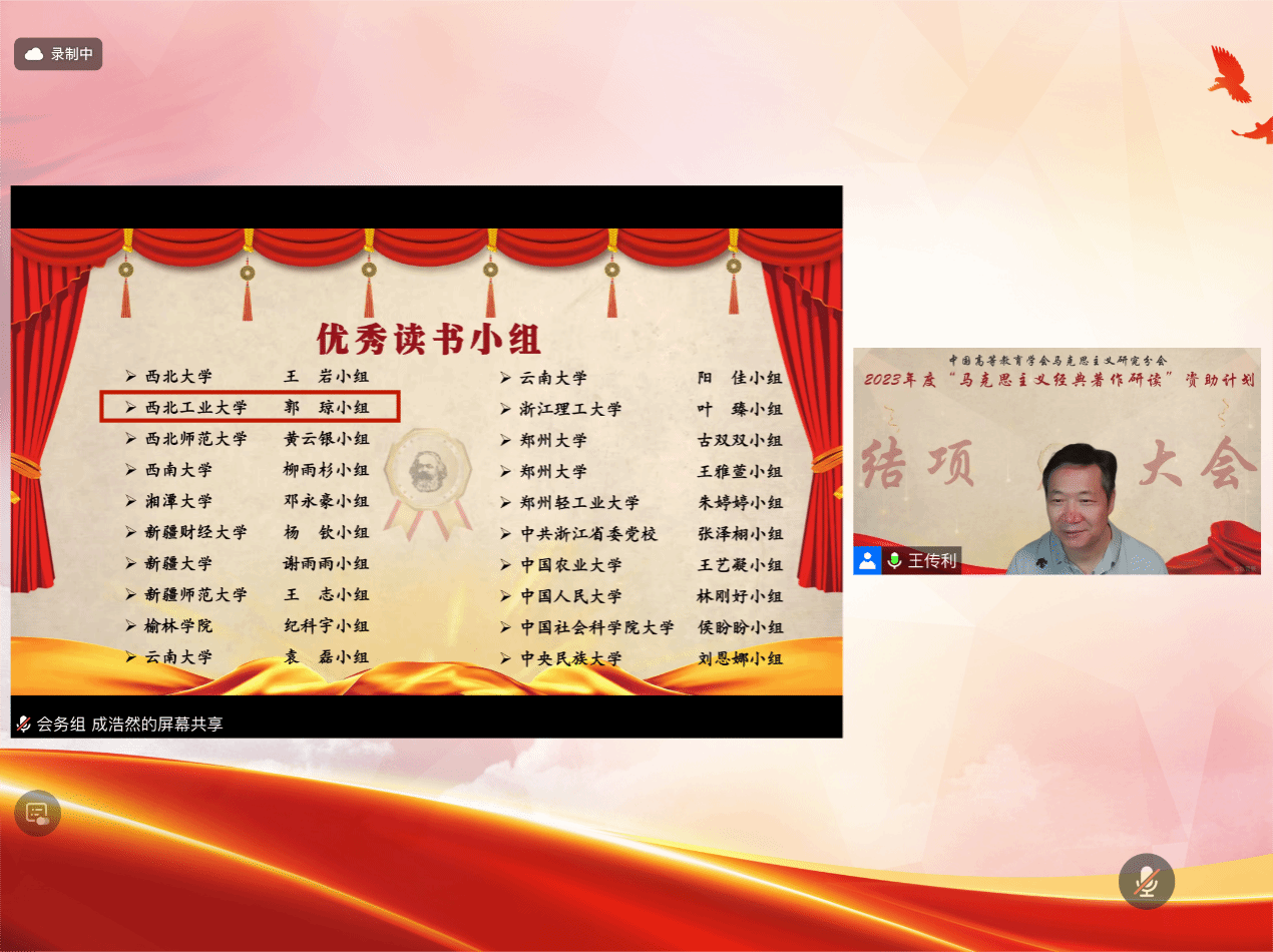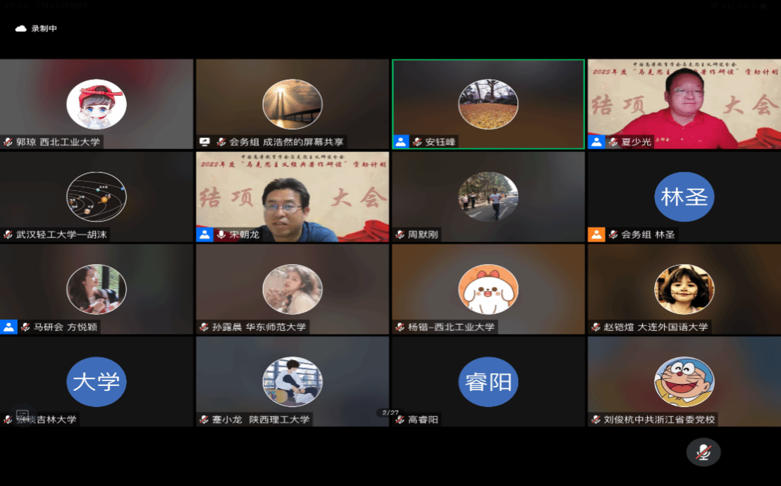 2024年7月25日,中国高等教育学会马克思主义研究分会(以下简称“马研会”)“马克思主义经典著作研读”资助计划结项交流大会顺利召开,会议由北京大学yl8858永利集团助理教授、马研会副秘书长夏少光主持,马研会领导、理事、百强读书小组全体成员及指导教师、马研会秘书处志愿者等近600人出席会议。经马研会资助计划组委会评审,我校“习近平新时代中国特色社会主义思想学习读书会”顺利结项,yl8858永利集团成功入选2023年度优秀组织单位,“习近平新时代中国特色社会主义思想学习读书会”也荣获“优秀读书小组”称号。