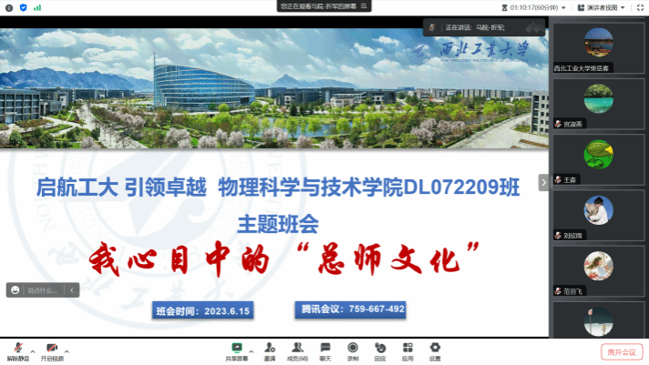 6月15日,折军、宫淑燕、柴岳春三位老师共同组织DL072209班、DL092205班、DL082202班同学联合开展“我心目中的总师文化”主题班会。折军老师首先介绍李言荣书记关于“总师文化”的媒体报道、“总师文化”的内涵特征。随后同学们踊跃发言,结合专业情况阐述自己对“总师文化”的理解,最后由宫淑燕、柴岳春两位老师总结学习“总师文化”的现实意义,鼓励同学们将西工大故事的精彩篇章继续延续,争做新一代“总师文化”的传承者、实践者。
