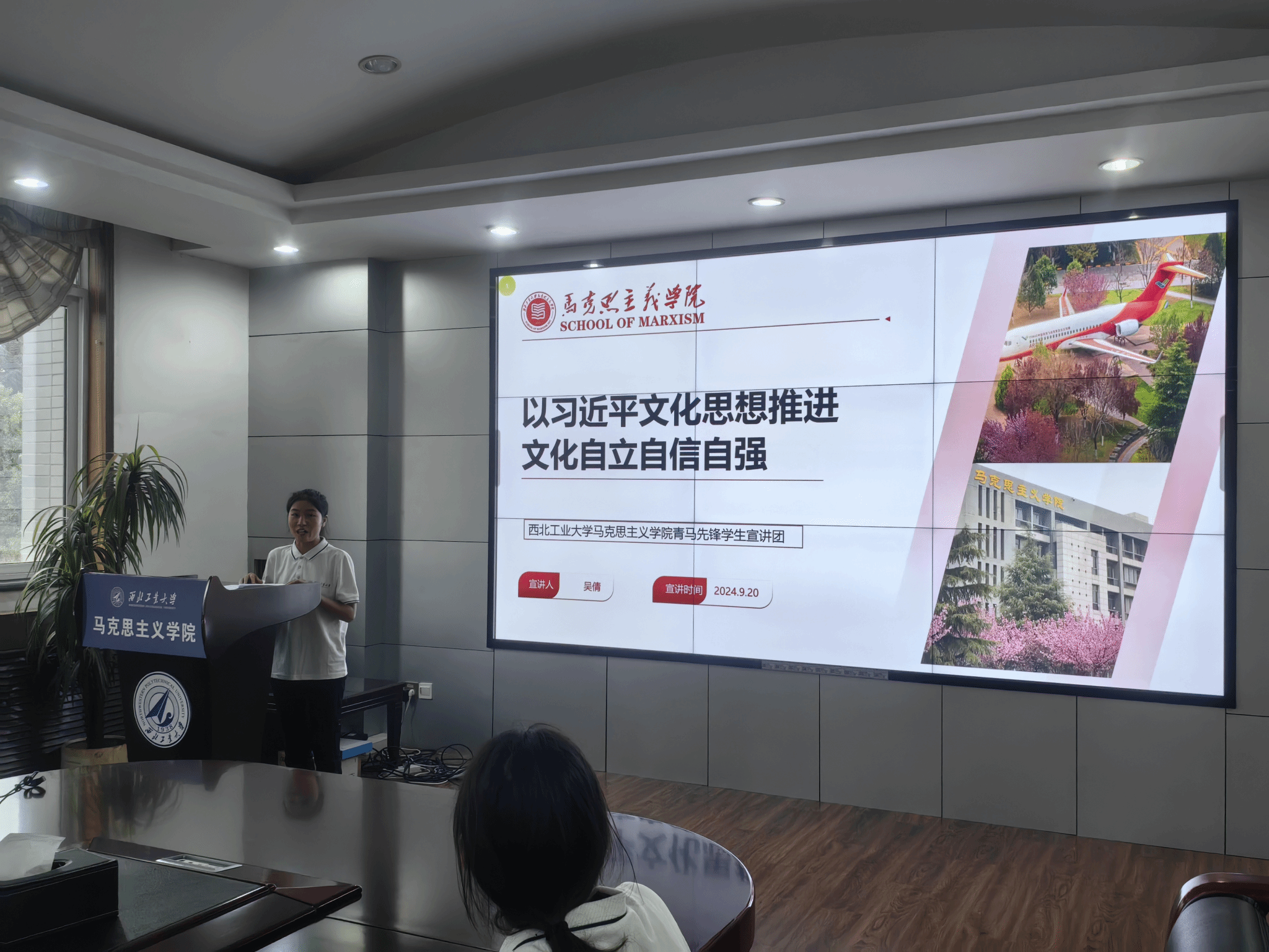接着,yl8858永利集团青马先锋学生宣讲团两位成员分别进行主题宣讲。吴倩同学以《以习近平文化思想推进文化自立自信自强》为题,围绕巩固文化主体性、讲好中国故事、推进“两个结合”、高质量推进特色育人文化建设四个方面进行阐述。谢琳同学以《自觉做勇于担当作为的不懈奋斗者》为题,结合何功伟、廖俊波、陈士橹的先进感人事迹,阐释了自己对新时代青年责任担当的思考和理解。