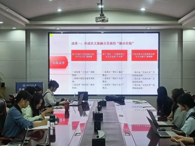 随后,学院暑期社会实践队风采展示与经验分享。汪毅代表“智汇红心”实践队展示了他们如何运用数字化赋能“大思政课”建设的实践调研成果;丘晨川代表“苗乡振兴•水韵融情”实践队展示了他们在广西融水地区探索“农文旅”深度融合优化路径的实践调研经历;崔晶鑫代表“镂木铄金,星火飞扬”实践队分享了“大思政课”与革命文物的奇遇之旅。这些精彩的分享不仅展示了学院青年学子广泛开展社会调研和实践的饱满热情、务实作风与创新能力,更为大家提供了宝贵的学习与借鉴机会。