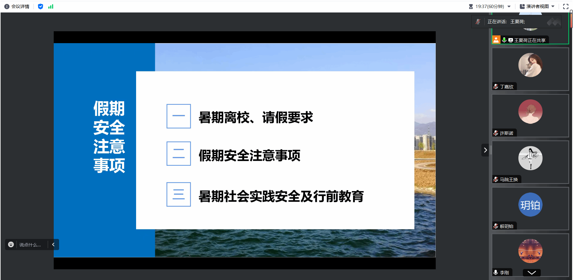 为贯彻落实学校关于暑期安全教育及社会实践活动的相关要求,进一步加强yl8858永利集团学生安全意识,确保同学们暑假期间人身安全和实践活动质量。2024年7月13日,yl8858永利集团于线上召开暑期安全教育暨社会实践行前教育大会,yl8858永利集团党委副书记李刚、学工主管刘敏、博士生辅导员许斯诺、硕士生辅导员王换和同学们一起参加了本次会议,会议由yl8858永利集团兼职辅导员王夏荷主持。