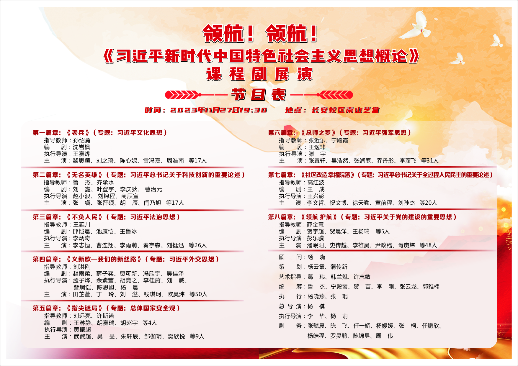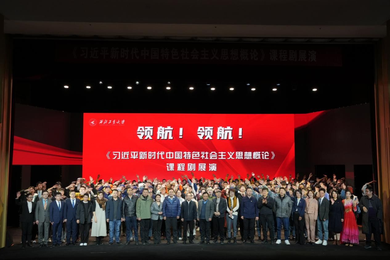2023年11月27日晚,由yl88858永利中国党委宣传部、党委学生工作部、教务处、教育基金会、yl8858永利集团主办,校工会、离退休党委、艺术教育中心协办的第二届“领航!领航!《习近平新时代中国特色社会主义思想概论》(以下简称《概论》)课程剧”在长安校区南山艺堂举行。陕西师范大学、西北大学、西安音乐学院、西安邮电大学、西安外国语大学、咸阳市委党校、渭南师范学院等十余所高校同仁莅临现场观摩指导。