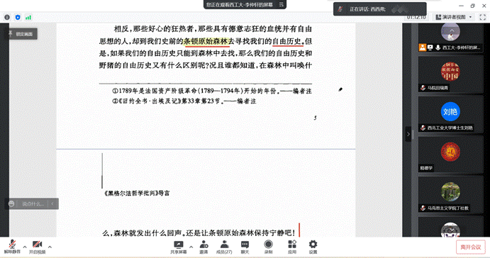 首先,张起梁老师向各位介绍了《黑格尔法哲学批判》导言的写作背景和历史背景,指出导言意义重大,标志着马克思在世界观和立场上的转变。硕士生李仲轩谈到了“而对宗教的批判是其他一切批判的前提”这一句的理解心得,认为人世间才是一切的本原,天国的现实性来自于幻想的现实性,在天国中找到的只是人类自身的反映。丁社教老师指出,在解读马恩原著时,要注重对德国历史、思想史的梳理,了解其深刻内涵和现实意义,并且硕博同学需要注重补充对原著基础性知识的把握。博士生黄奕采谈到解读文本后,可以体会到当时的德国落后的现实制度,并且提出了“牧羊人”的问题。张云龙教授为同学联系中西方文化解释说,在西方宗教里,牧羊人有其出处,指的是耶稣,后来泛指神职人员,马克思在此处主要是对当时流行的宗教救赎的批判。