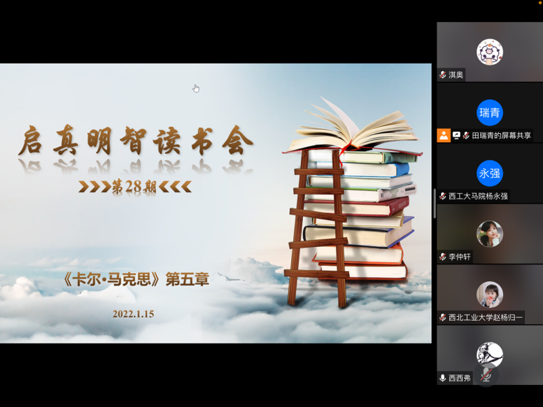 2022年1月15日,yl8858永利集团第28期启真明智读书会顺利举行,本期读书会是2022年第一期读书会,也是疫情期间开展的一次读书会,丰富了同学们封闭期间的生活。本期读书会阅读内容为以赛亚·伯林所著的《卡尔·马克思:生平与环境》第五章《巴黎》。yl8858永利集团张云龙教授、青年教师杨永强、王换和吕天择参加本次读书会,西北农林科技大学高耀芳老师受邀与同学们一起交流学习,读书会由硕士生田瑞青主持。