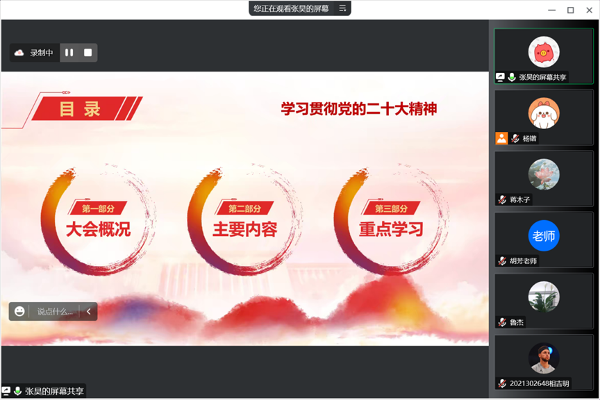读书会的第一位导读人是我院硕士生张昊同学。他从大会概况、内容概要、重点导读和问题思考四个部分展开。首先是第一部分,大会概况。2022年10月16日至10月22日,中国共产党第二十次全国代表大会在北京召开,习近平总书记代表第十九届中央委员会向党的二十大作的题为《高举中国特色社会主义伟大旗帜 为全面建设社会主义现代化国家而团结奋斗》的报告。第二部分,内容概要。从15个部分集中讲述了党的二十大报告的要点,认为报告擘画了全面建成社会主义现代化强国的宏伟蓝图和实践路径,就未来5年党和国家事业发展制定了大政方针、作出了全面部署。第三部分,重点导读。张昊同学重点讲解了“两个结合”、“中国式现代化”、“安全”三个关键词,指出“两个结合”很大程度上深化了我们党对坚持和发展马克思主义的规律性认识,也是我们理解和把握习近平新时代中国特色社会主义思想的关键。中国式现代化切合中国实际,体现了社会主义建设规律,把握了人类社会发展规律,同时具有鲜明的开放性、包容性和强大的感召力。党的二十大报告从统筹发展和安全的战略高度对国家安全做出新的部署,体现出国家安全在党和国家工作大局中的极端重要性。最后,张昊同学也向老师提出作为yl8858永利集团的学生,应该重点从哪方面和以什么方式来深入学习党的二十大报告,真正做到学习深入、学以致用的问题。