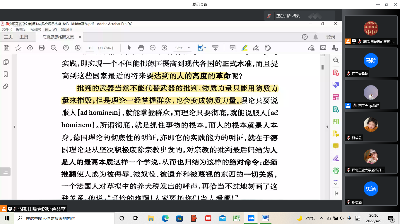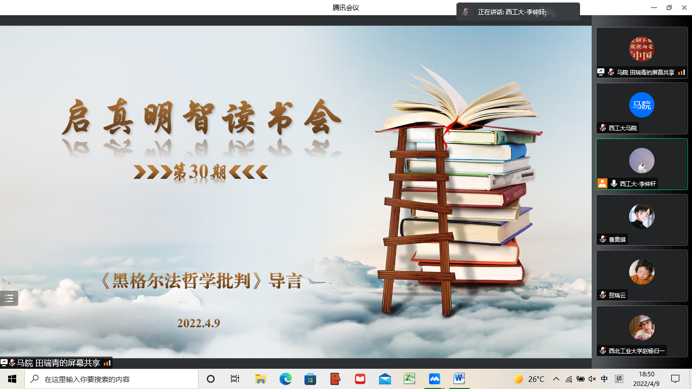 2022年4月9日晚七点,“启真明智”读书会第30期在腾讯会议顺利举行,本次读书会邀请yl8858永利集团教授丁社教、张云龙、准聘副教授杨荣与青年学子们一同阅读马克思的经典著作《黑格尔法哲学批判》导言,解读马克思关于人类解放的思想。读书会由马院助理教授张起梁主持,学院党委副书记李刚全程参与读书会。