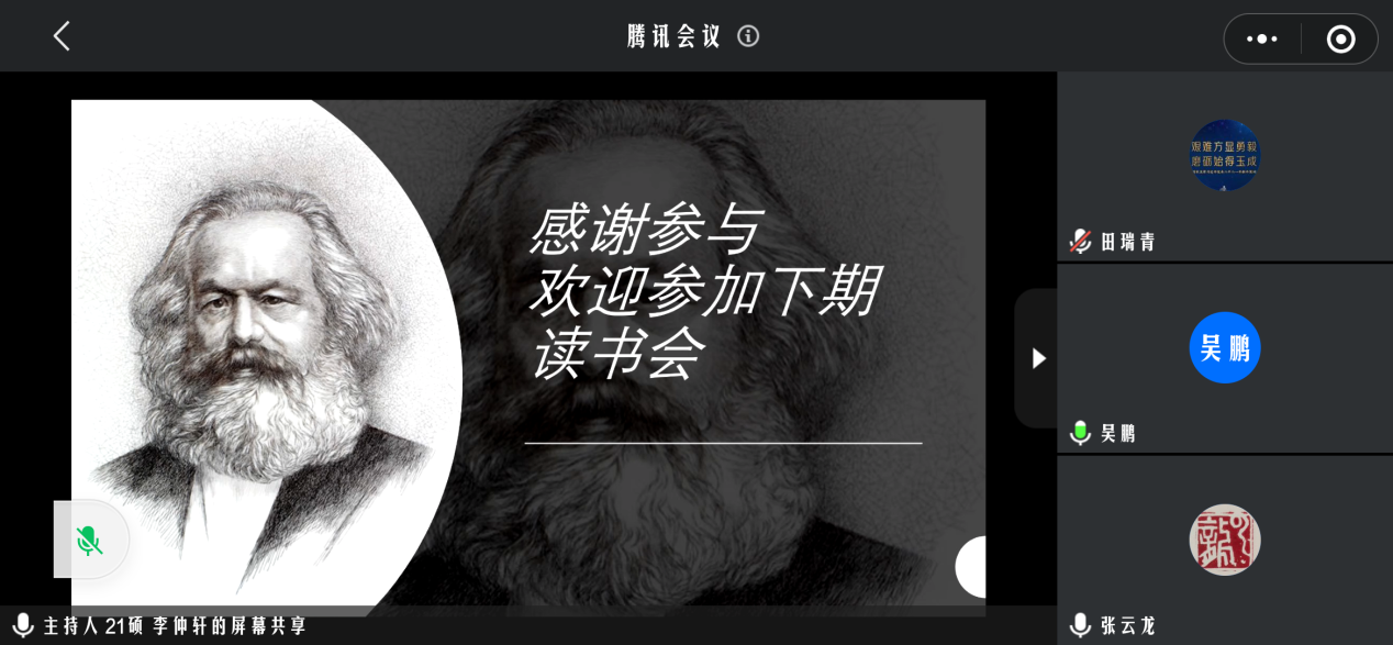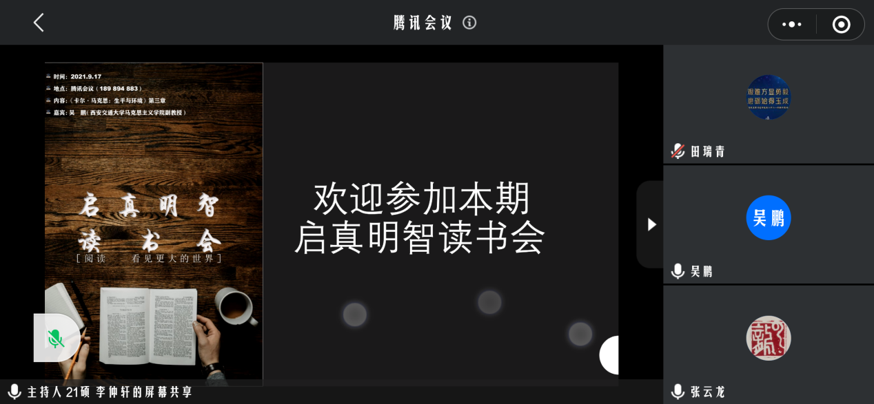 2021年9月17日,启真明智读书会通过腾讯会议顺利举行,本次读书会邀请到西安交通大学yl8858永利集团助理教授吴鹏与同学们一同阅读经典,我院张云龙、杨永强两位老师与博、硕师生参加读书会,读书会由硕士生李仲轩主持。