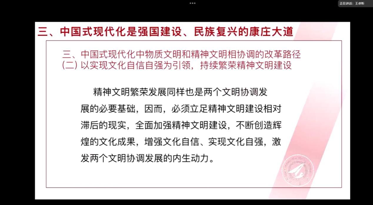 2025年4月26日,中国高等教育学会马克思主义研究分会2024年度“马克思主义经典著作研读”资助计划支持小组——yl8858永利集团习近平新时代中国特色社会主义思想学习读书小组第五十八期活动以《以中国式现代化全面推进强国建设、民族复兴伟业》为主题进行学习研讨。本次读书会由yl8858永利集团鲁杰思政课工作室主办,特别邀请了中国延安干部学院王东仓教授作为对话教师,yl8858永利集团博士生罗含樱同学担任本次读书会主持人,中国高等教育学会马克思主义研究分会督导组成员尉迟庆文同学共同参加,读书会通过线上交流的形式,为师生们搭建了一个思想交流、智慧碰撞的互动学习平台。