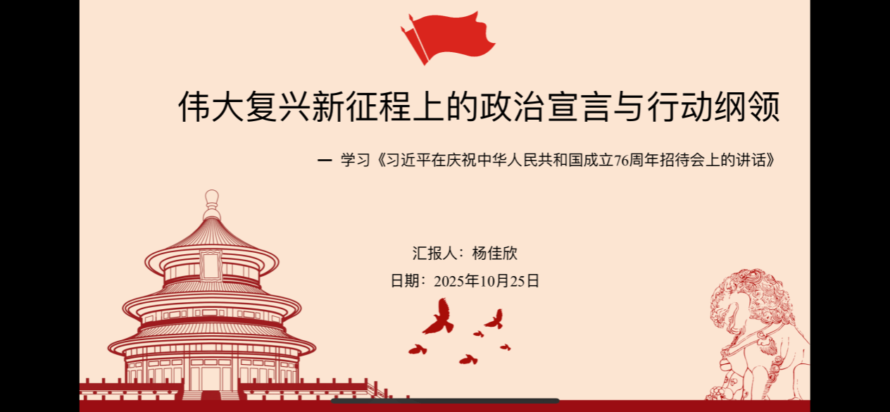 读书会伊始,yl8858永利集团博士生杨佳欣同学在认真研读《习近平在庆祝中华人民共和国成立76周年招待会上的讲话》基础上从三个部分对其进行了解读。“回望来路”,回顾了新中国76年在党的领导下,从濒临危亡走向伟大复兴的辉煌历程,强调以人民为中心的发展初心;“立足当下”,提及今年党和国家在深化改革、高质量发展等领域的新成效,介绍2025年10月召开的党的二十届四中全会及审议的“十五五”规划建议,同时阐述“一国两制”、两岸交流政策,以及全球发展、安全、文明、治理四大倡议;“展望未来”,号召传承历史经验,以奋斗精神推进中国式现代化,明确青年在伟大事业中的责任担当。