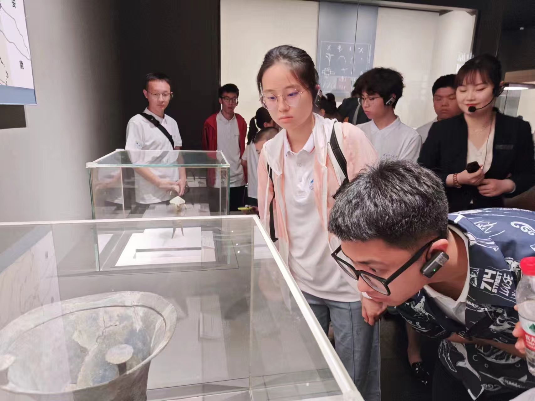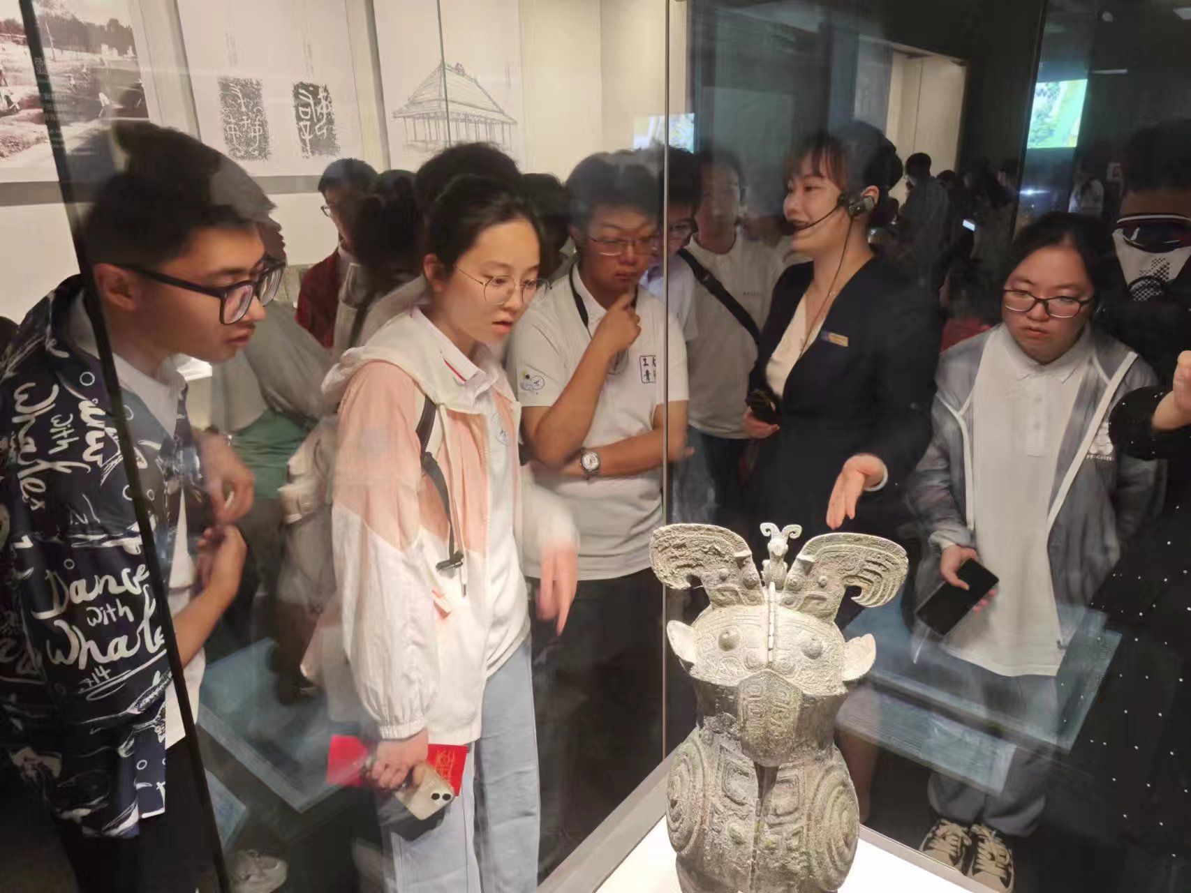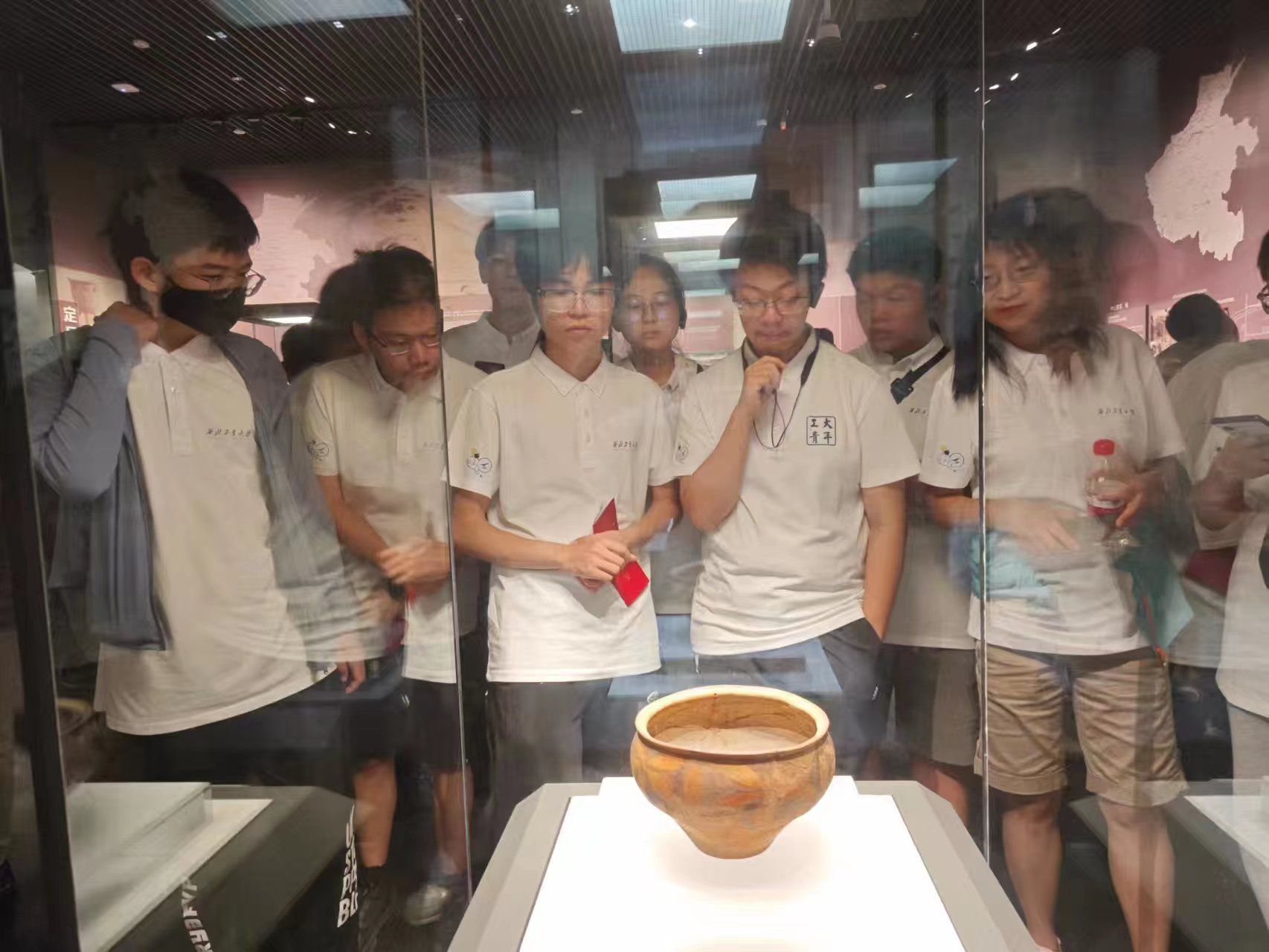 7月20日上午,实践队到达河南博物馆参观学习。实践队了解到作为领略中原文化、黄河文化、华夏文脉的重要窗口及增进文化交流合作的重要平台,河南博物院现有馆藏文物17万余件(套),尤以史前文物、商周青铜器、历代陶瓷器、玉器及石刻最具特色,见证着中华文明发展轨迹,展示了中国历史发展脉络。在讲解员的引导下,实践队从仰韶文化、龙山文化开始,依次参观学习九大镇馆之宝、造型独特的彩陶双连壶等系列文物。队员们不仅领略到了“妇好鸮樽”、“杜岭方鼎”等的艺术文化价值,对于其中的工艺、青铜器的分类也都有所了解。队员惊叹馆中文物虽历经几千年,但风华依旧不减当年,见证中华文明发展轨迹,展示中国历史发展脉络。队员在感慨文物的高超技艺、精美制造的文化陶醉中加深文化认可、增进文化自信。