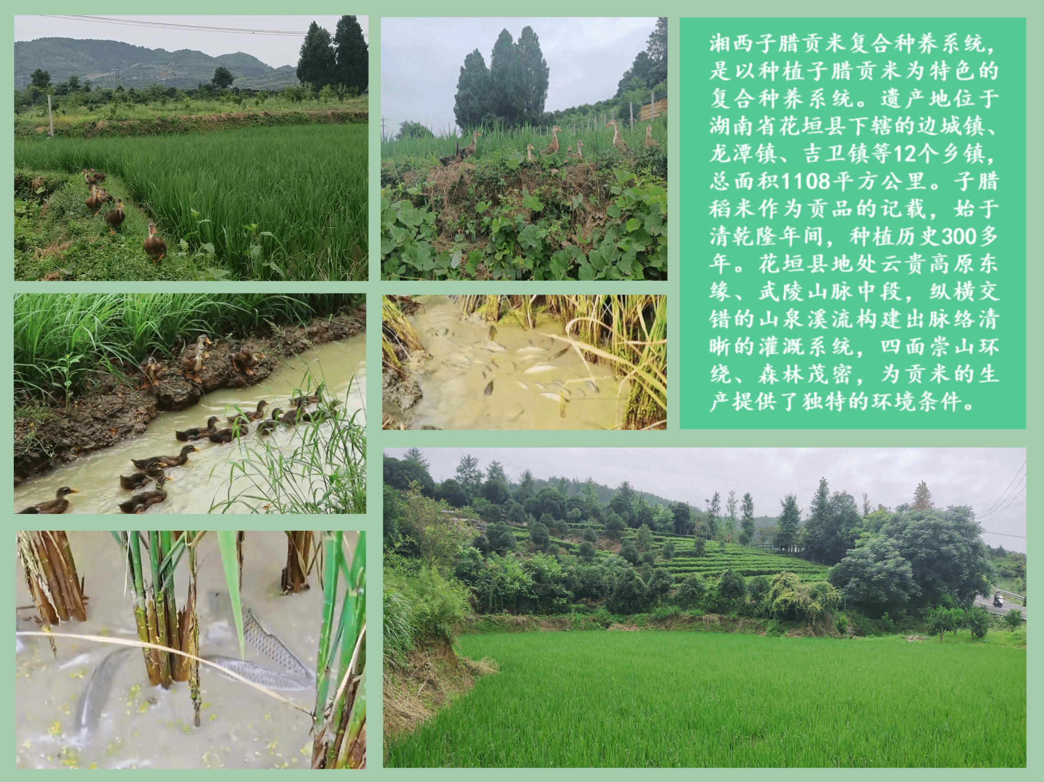 子腊贡米复合种养系统,是以种植具有三千多年历史的子腊贡米为特色的复合种养系统。文化遗产地位于湖南省花垣县下辖的边城镇、龙潭镇、石栏镇、吉卫镇等12个乡镇。7月16日,实践队来到子腊村,探访苗族先民们留下的宝贵农业文化遗产。当地农民创造性运用铺树造田、林稻结合等技术,改造不利的自然条件,最终形成了适宜栽培子腊贡米的生态环境遗产地。子腊农民具有较强的生态种植意识,以“生态、环保、有机”为种植理念,积极保护特殊稻田。在种植子腊贡米的过程中还实行综合种养,将鸭、鸟、蚌、蛙、鱼等养殖与水稻种植相结合,逐渐形成一整套生物多样性保护和生态环境良性循环的农业生态体系,从而成为特色鲜明的少数民族农耕文化瑰宝。本地继承发展复合种养系统,不仅增加了子腊农民自身的经济收入,而且更好地保护了农业生物的多样性,为发展生态农业起到了重要作用。