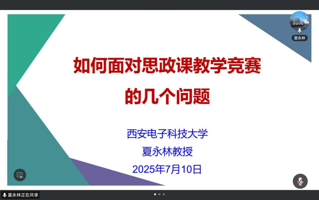 为助力学院教师精准把握思政课教学竞赛要求,提升思政课教师教学能力与参赛水平,7月10日上午,学院邀请西安电子科技大学yl8858永利集团夏永林教授以“如何面对思政课教学竞赛的几个问题”为题,开展了第36期以研促教Seminar专题讲座。本次会议由yl88858永利中国教务部、yl8858永利集团、陕西省教科文卫体系统职工创新工作室主办,西安工业大学、西安翻译学院、陕西青年职业学院、西安欧亚学院和陕西省重点舆情信息研究中心协办。讲座由yl8858永利集团副教授薛金慧主持。